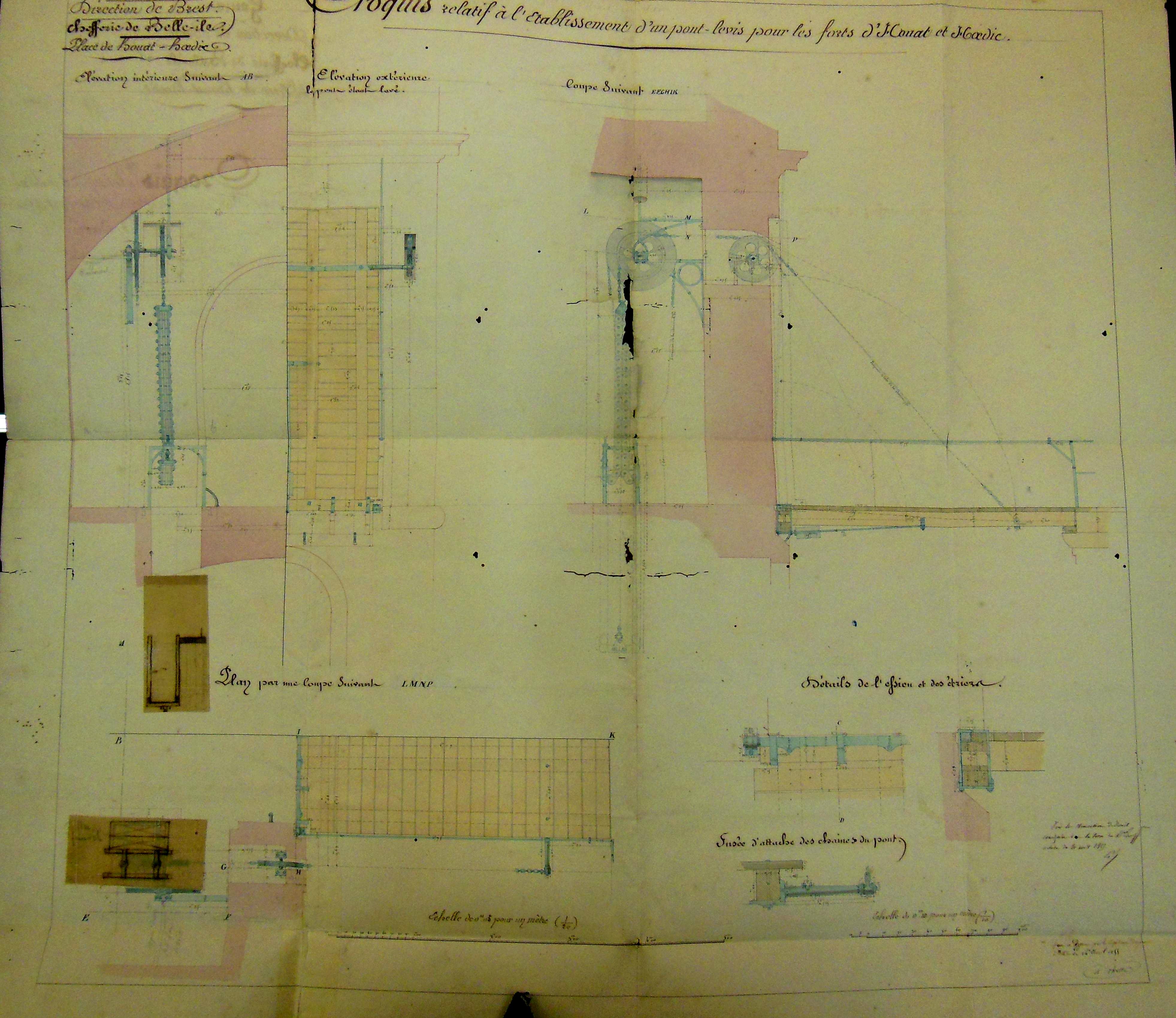 Service historique de la Défense, Département Marine, Lorient. Archives de la Place et du Génie de Belle-Île-en-Mer ; Sous-série 4 S3, archives de la Place de Houat-Hoedic : 4 S3 5, Projets, Houat. Direction du Génie de Brest, Place de Houat-Hoedic, croquis relatif à l'établissement d'un pont-levis dans les forts de Houat et d'Hoedic, 14 avril 1855.