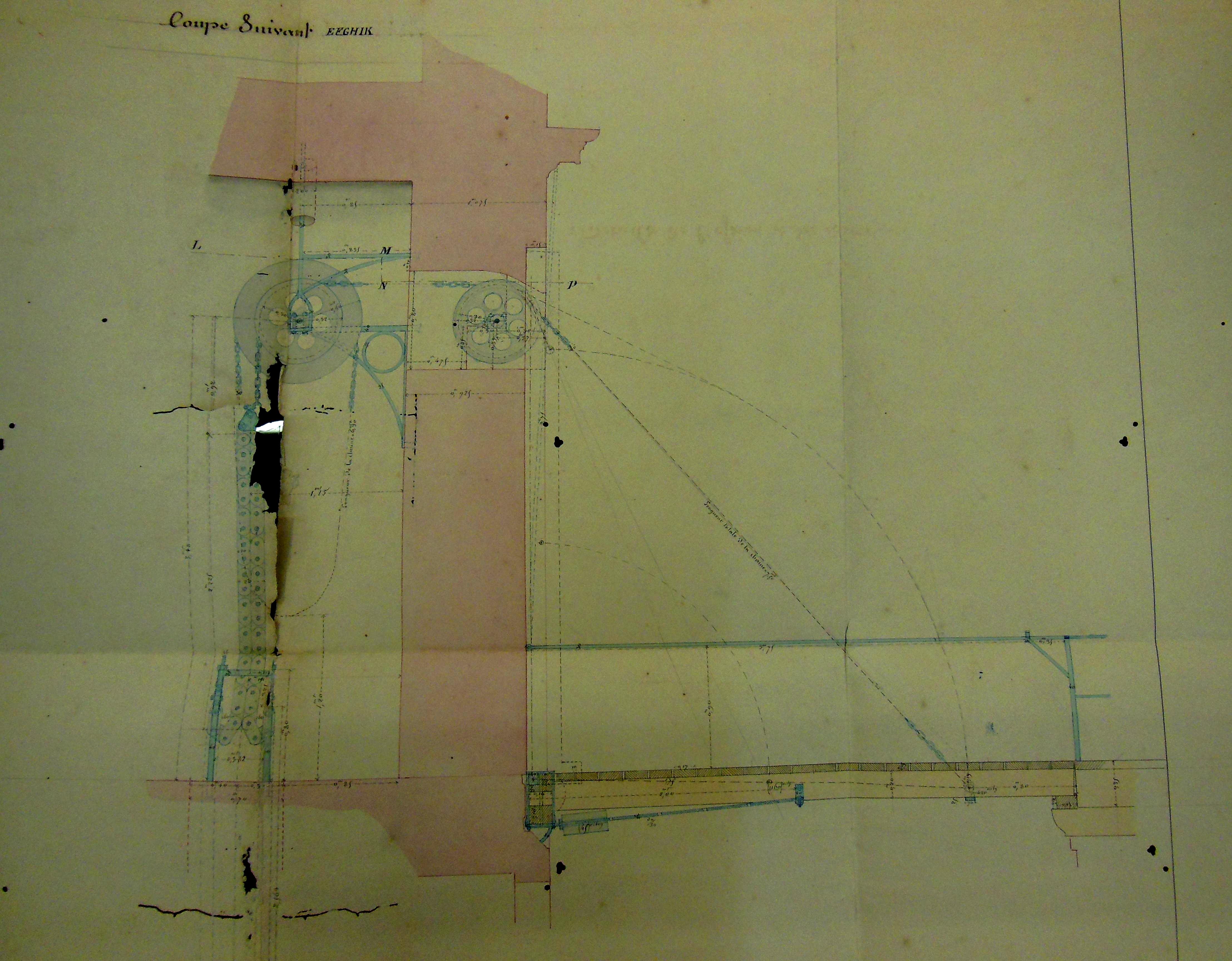 Service historique de la Défense, Département Marine, Lorient. Archives de la Place et du Génie de Belle-Île-en-Mer ; Sous-série 4 S3, archives de la Place de Houat-Hoedic : 4 S3 5, Projets, Houat. Direction du Génie de Brest, Place de Houat-Hoedic, croquis relatif à l'établissement d'un pont-levis dans les forts de Houat et d'Hoedic, 14 avril 1855.