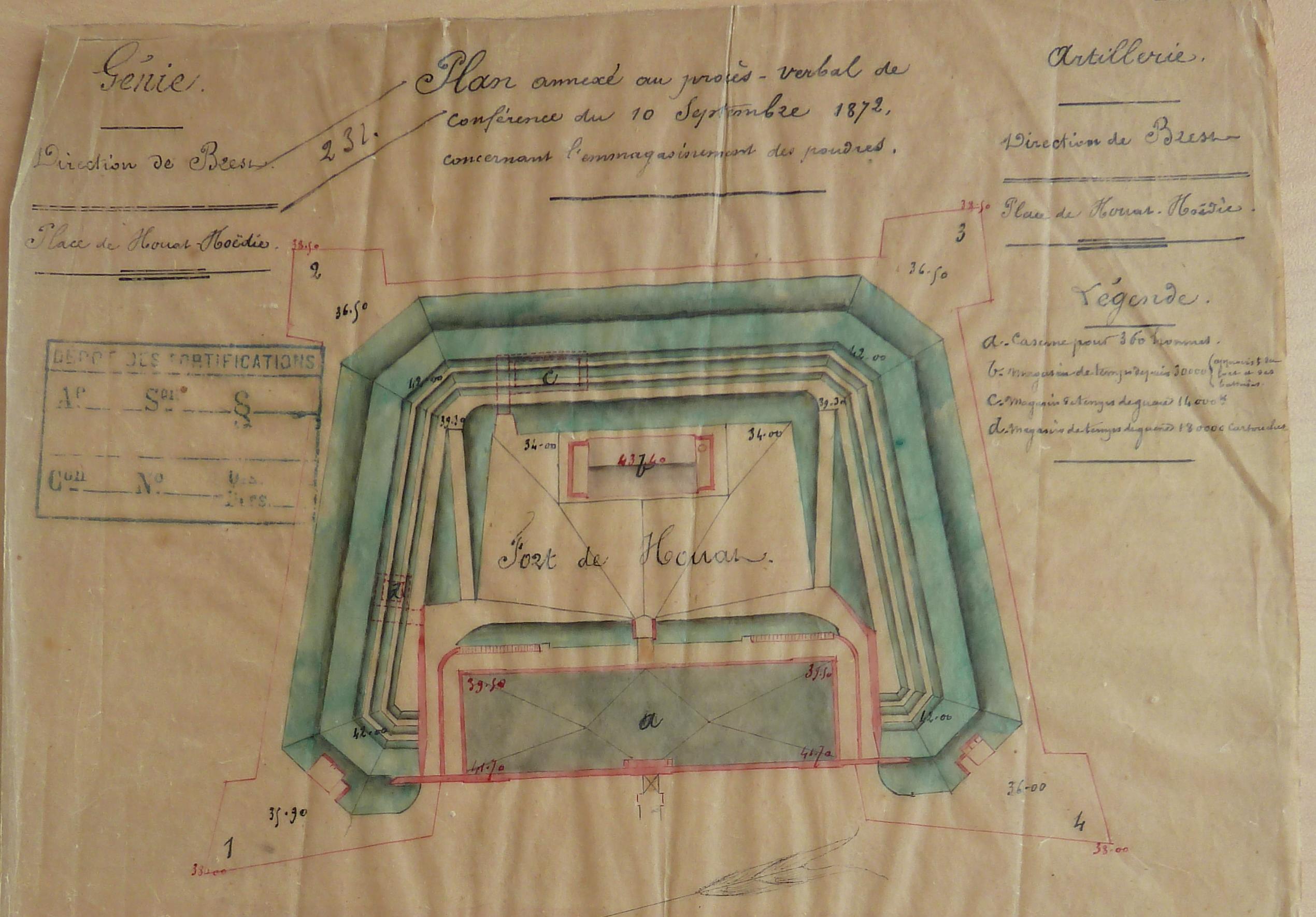 Service historique de la Défense, département Armée de Terre, Vincennes. Archives du Génie ; Article 8, Places françaises et d'Algérie : 1 VH 881, Place de Houat-Hoedic, projets et dépenses annuels, 1863-1875. Direction du Génie de Brest, Place de Houat-Hoedic, plan annexé au procès-verbal de conférence du 10 septembre 1872 concernant l'emmagasinement des poudres.