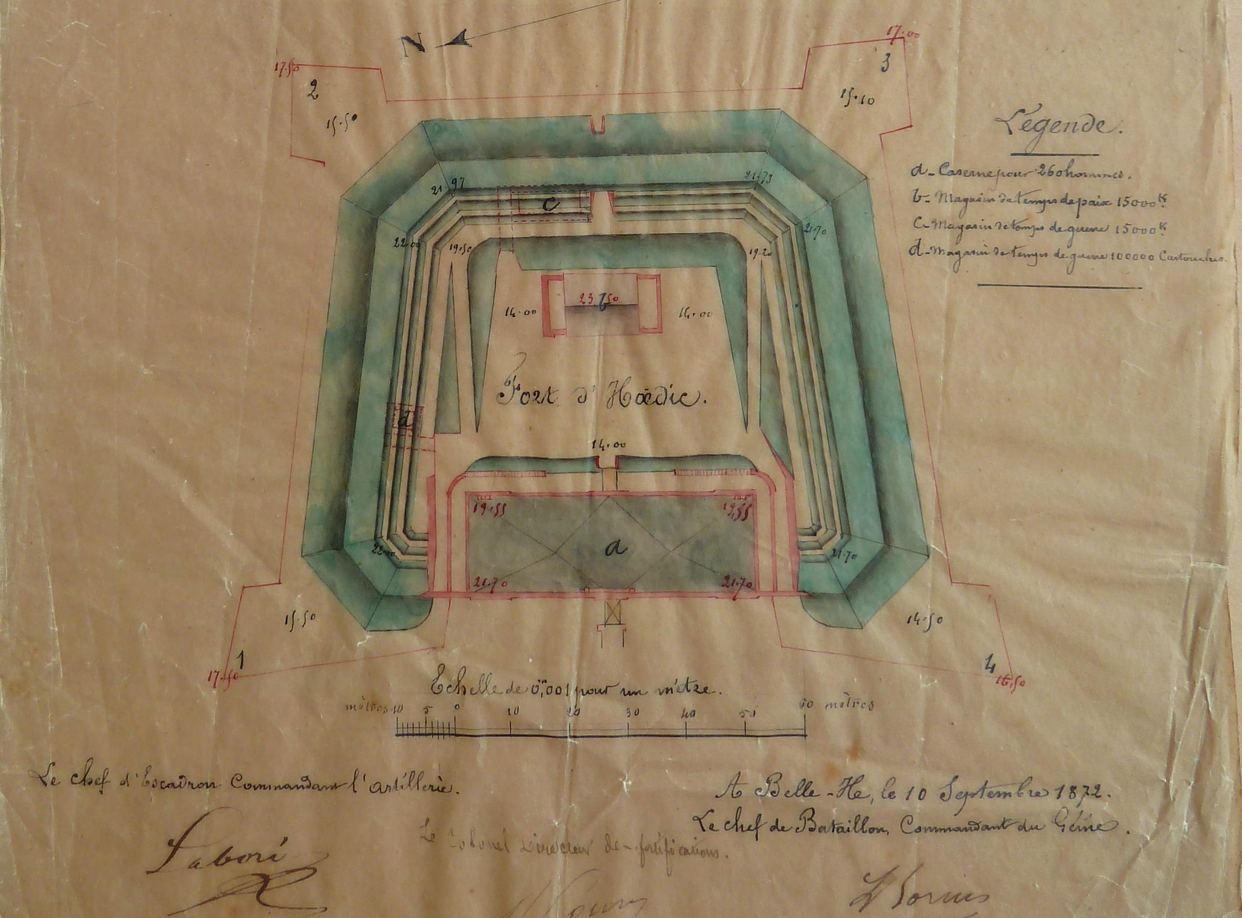 Service historique de la Défense, département Armée de Terre, Vincennes. Archives du Génie ; Article 8, Places françaises et d'Algérie : 1 VH 881, Place de Houat-Hoedic, projets et dépenses annuels, 1863-1875. Direction du Génie de Brest, Place de Houat-Hoedic, plan annexé au procès-verbal de conférence du 10 septembre 1872 concernant l'emmagasinement des poudres.