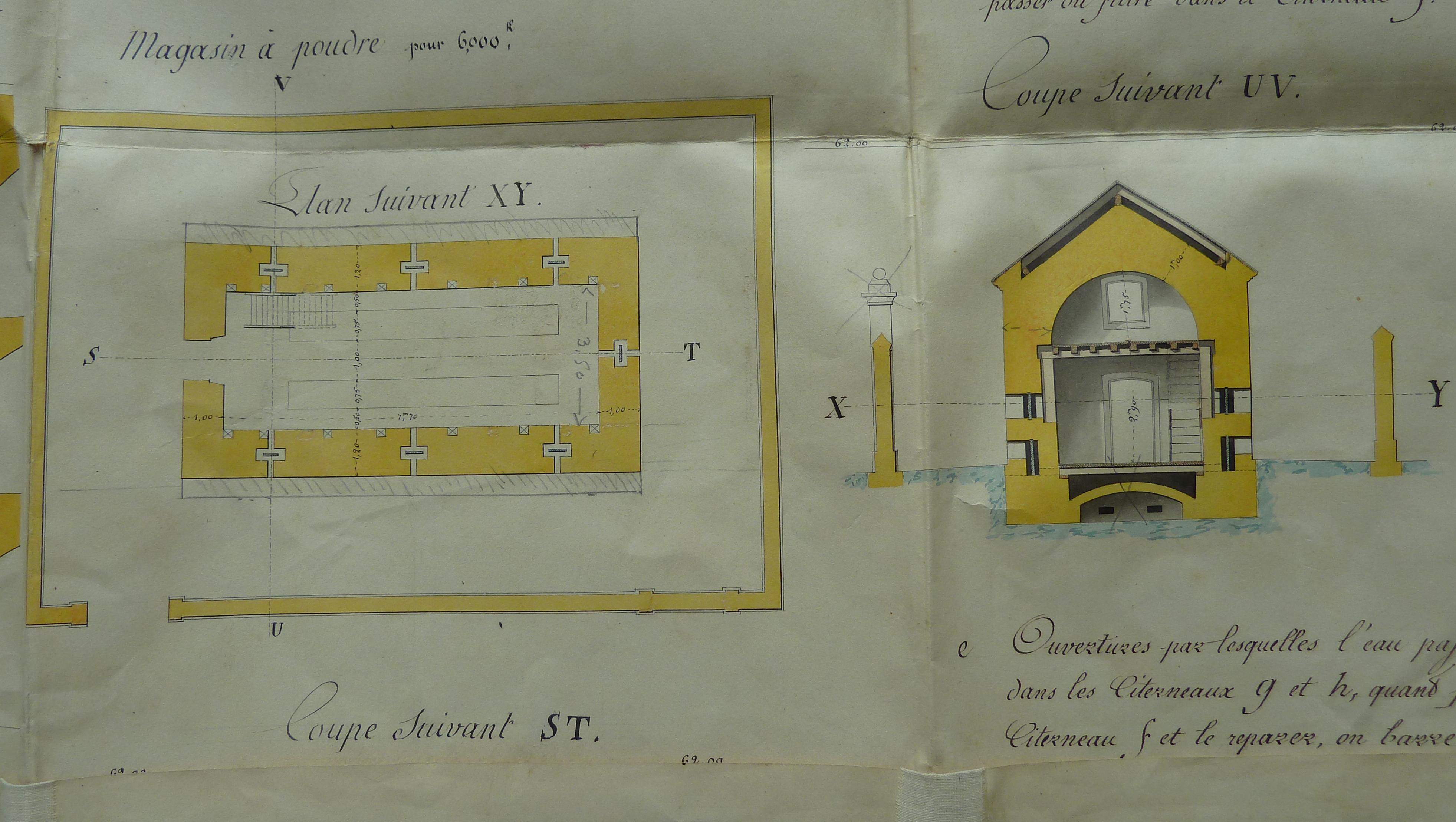 1 VH 292. Place de Belle-Ile, feuille n° 2 des projets extraordinaires pour 1847, fort central de l'Ile d'Houat, caserne voûtée à l'épreuve, magasin à poudre et latrines, 17 décembre 1846.Immatriculation