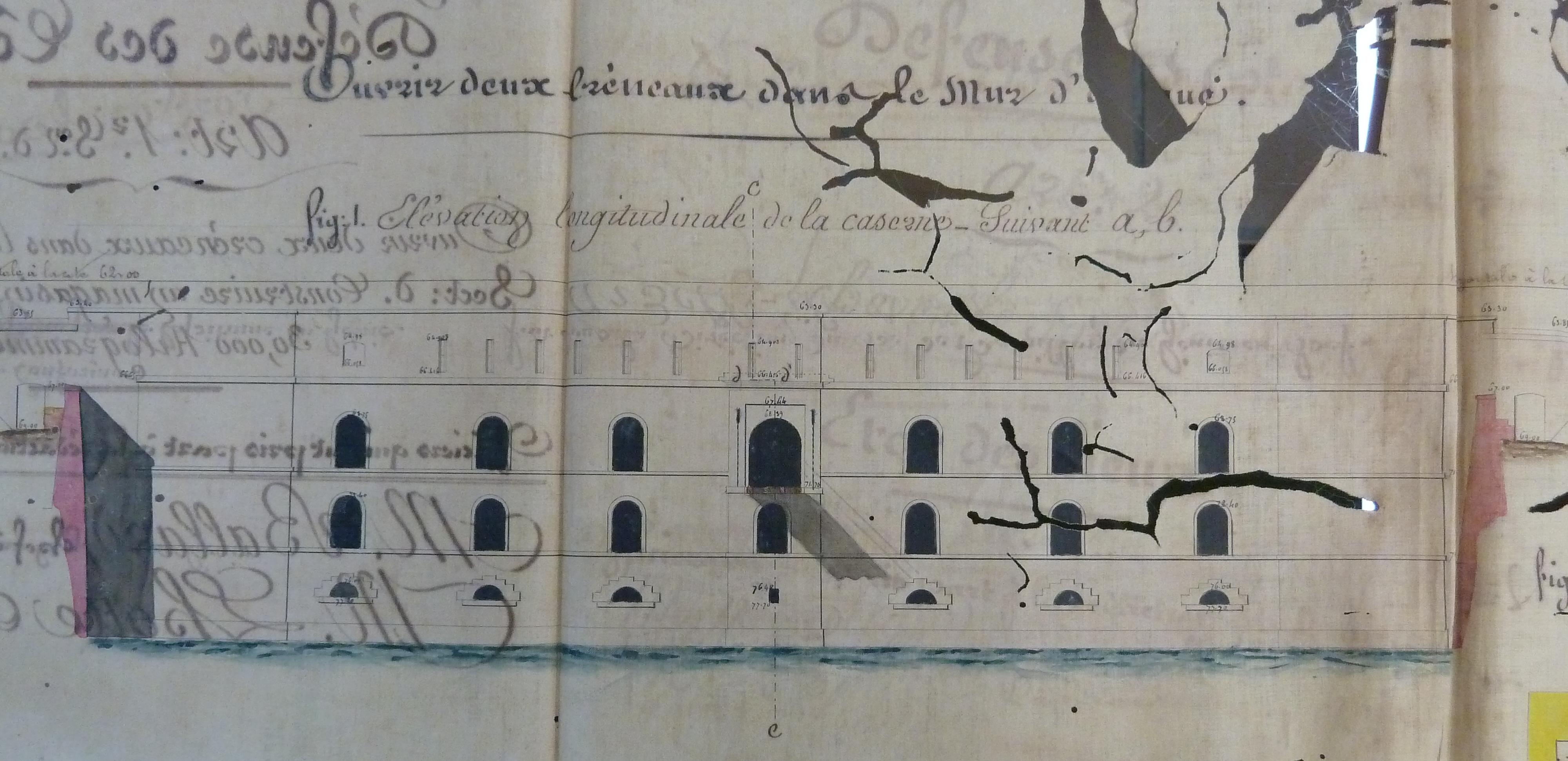 Service historique de la Défense, Département Marine, Lorient. Archives de la Place et du Génie de Belle-Île-en-Mer ; Sous-série 4 S3, archives de la Place de Houat-Hoedic : 4 S3 5, projets, Houat. Direction du Génie de Brest, Place de Houat-Hoedic, feuille n° 3 des projets pour 1855-1856, achever le fort de Houat, 20 novembre 1854.