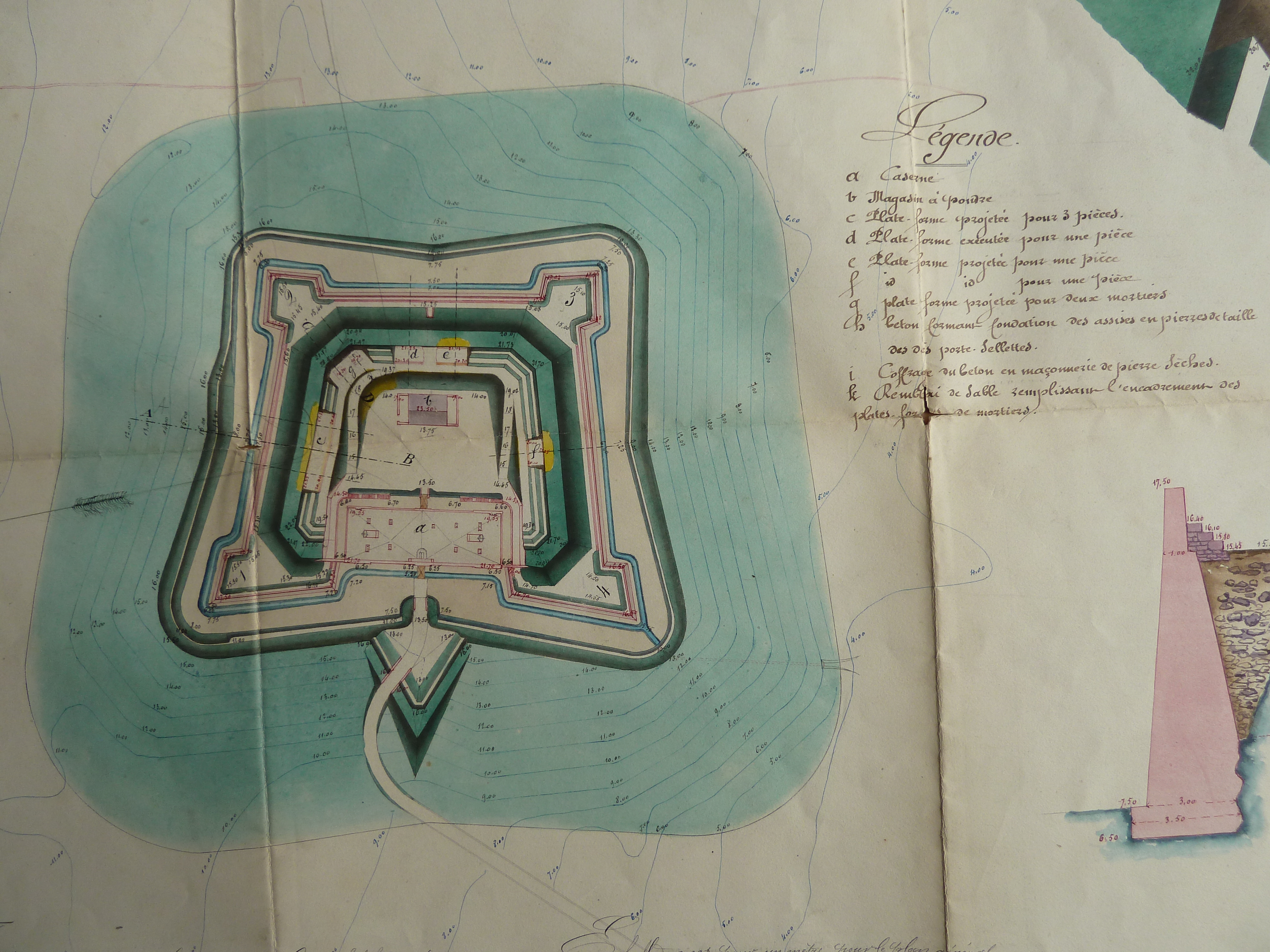 Service historique de la Défense, département Armée de Terre, Vincennes. Archives du Génie ; Article 8, Places françaises et d'Algérie : 1 VH 881, Place de Houat-Hoedic, projets et dépenses annuels, 1863-1875. Direction du Génie de Brest, Place de Houat-Hoedic, feuille n° 1 des projets pour 1863-1864, terminer l'établissement des plates-formes des pièces composant l'armement du fort d'Hoedic, 31 décembre 1862.