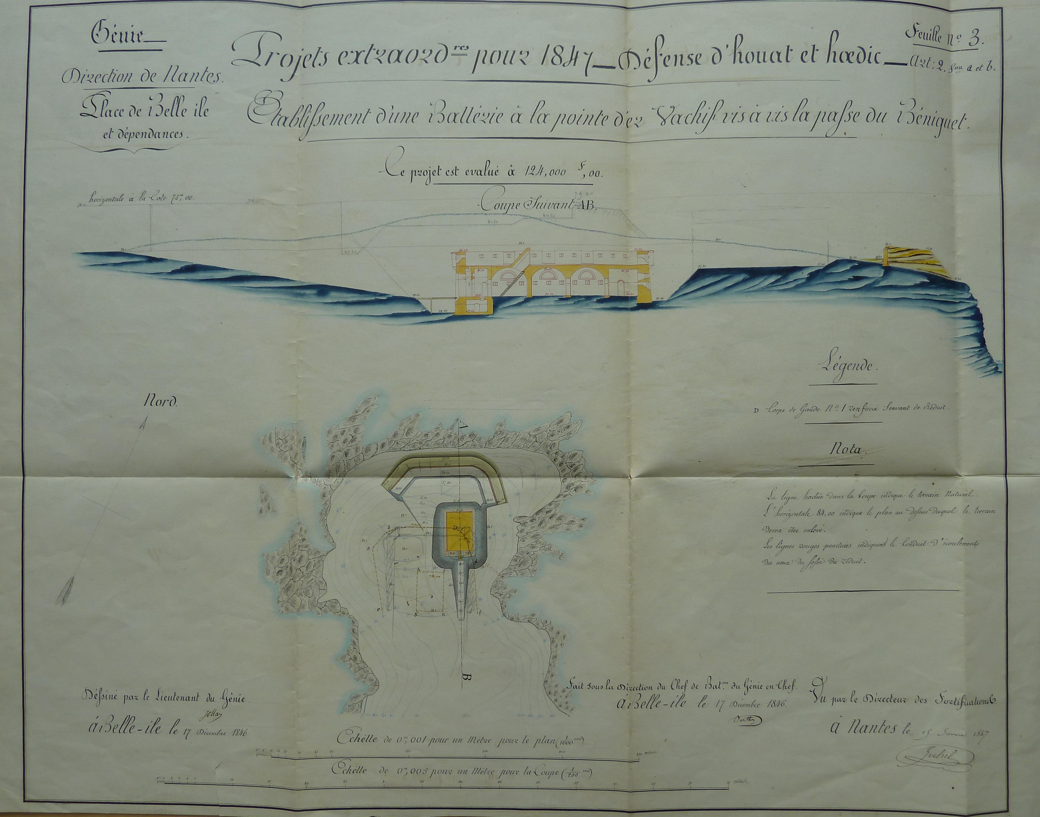 Service historique de la Défense, département Armée de Terre, Vincennes. Archives du Génie ; Article 8, Places françaises et d'Algérie : 1 VH 292, Place de Belle-Île-en-Mer, projets et dépenses annuels, 1847. Direction du Génie de Nantes, Place de Belle-Ile, feuille n° 3 des projets extraordinaires pour 1847, établissement d'une batterie à la pointe d'Er Vachif vis-à-vis la passe du Béniguet, 17 décembre 1846.