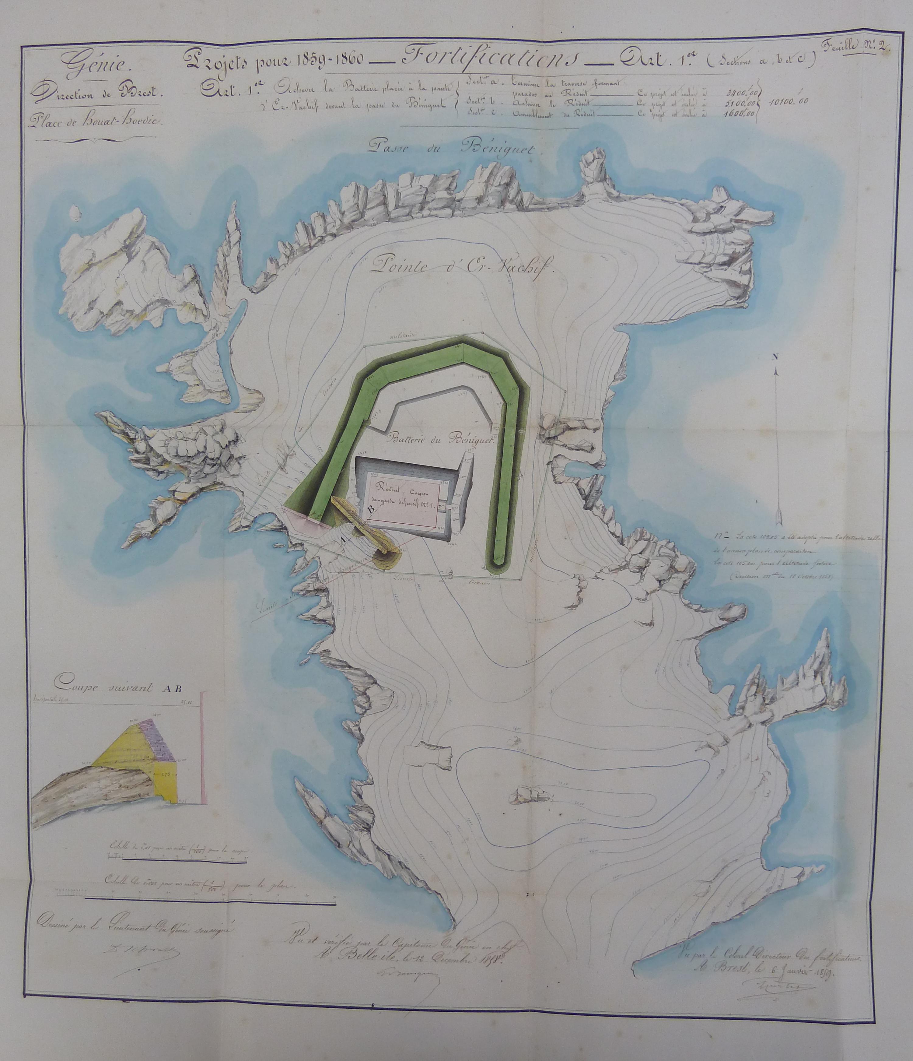 Service historique de la Défense, Département Marine, Lorient. Archives de la Place et du Génie de Belle-Île-en-Mer ; Sous-série 4 S3, archives de la Place de Houat-Hoedic : 4 S3 5, projets, Houat. Direction du Génie de Brest, Place de Houat-Hoedic, feuille n° 2 des projets pour 1859-1860, achever la batterie placée à la pointe d'Er Vachif devant la passe du Béniguet, 12 décembre 1858.