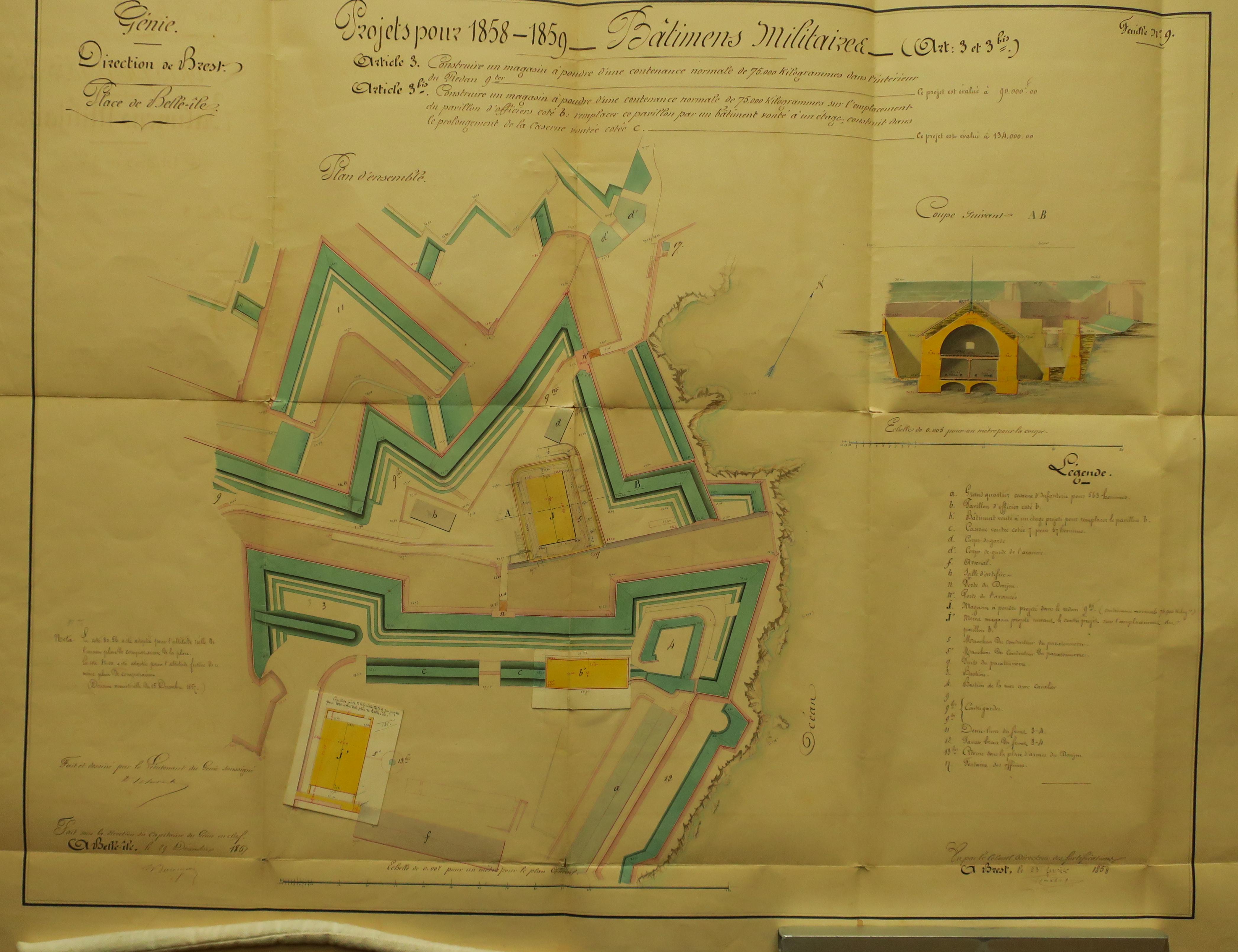Service historique de la Défense, département Armée de Terre, Vincennes. Archives du Génie ; Article 8, Places françaises et d'Algérie : 1 VH 295, Place de Belle-Île-en-Mer, projets et dépenses annuels, 1858-1859. Direction du Génie de Brest, Place de Belle-Ile, feuille n° 9 des projets pour 1858-1859, magasins à poudre, 29 décembre 1857.