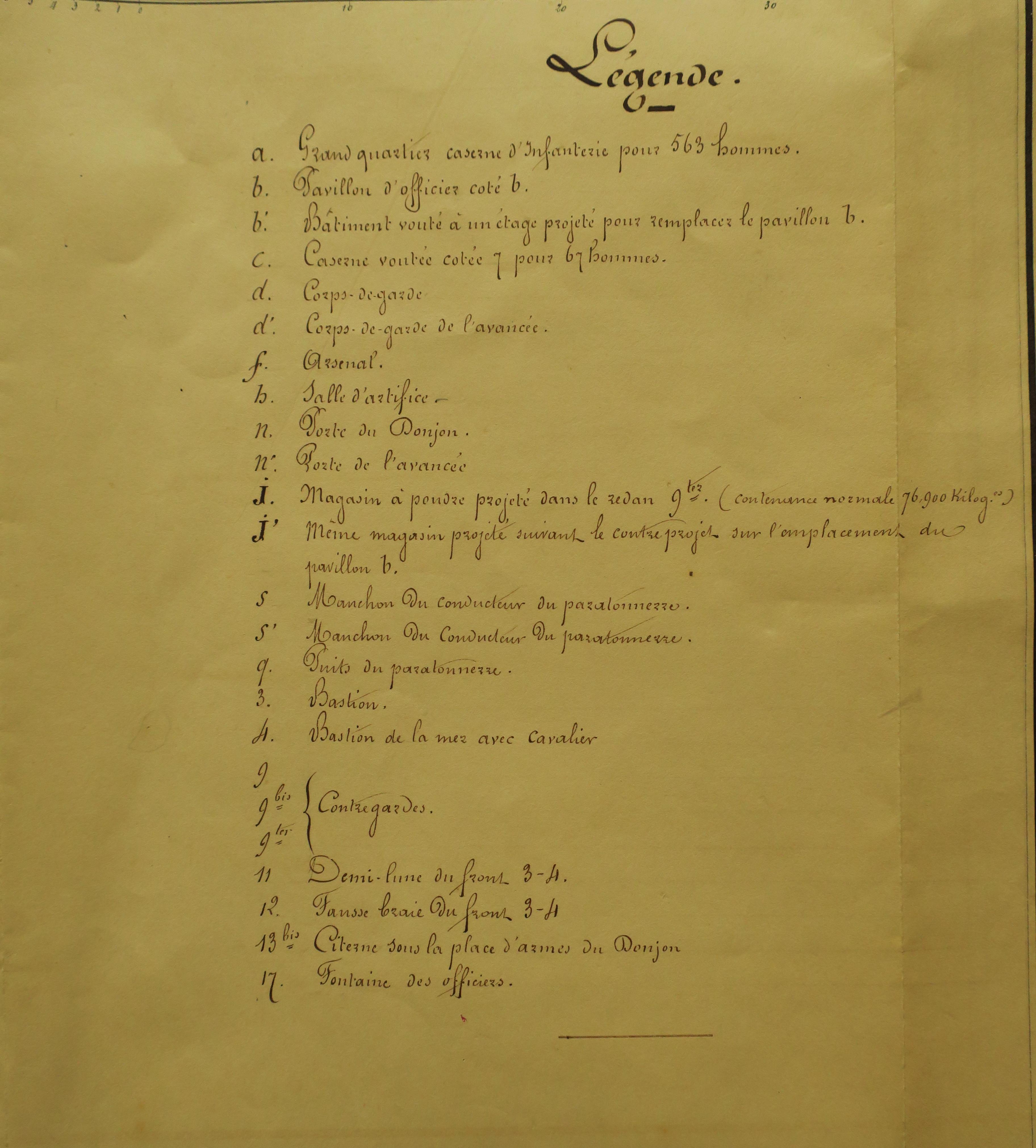 Service historique de la Défense, département Armée de Terre, Vincennes. Archives du Génie ; Article 8, Places françaises et d'Algérie : 1 VH 295, Place de Belle-Île-en-Mer, projets et dépenses annuels, 1858-1859. Direction du Génie de Brest, Place de Belle-Ile, feuille n° 9 des projets pour 1858-1859, magasins à poudre, 29 décembre 1857.
