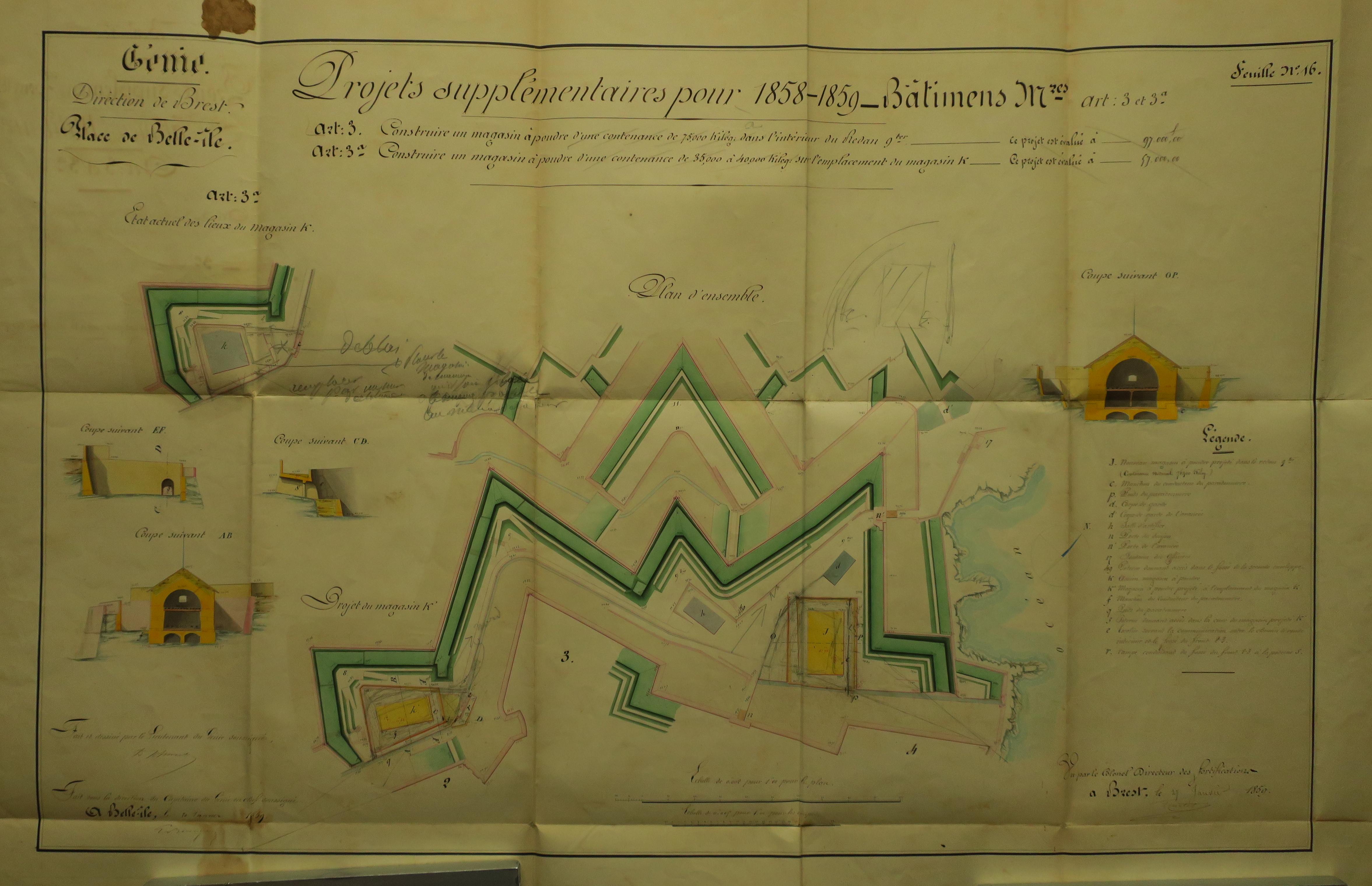 Service historique de la Défense, département Armée de Terre, Vincennes. Archives du Génie ; Article 8, Places françaises et d'Algérie : 1 VH 295, Place de Belle-Île-en-Mer, projets et dépenses annuels, 1858-1859. Direction du Génie de Brest, Place de Belle-Ile, feuille n° 16 des projets supplémentaires pour 1858-1859, magasins à poudre, 20 janvier 1859.