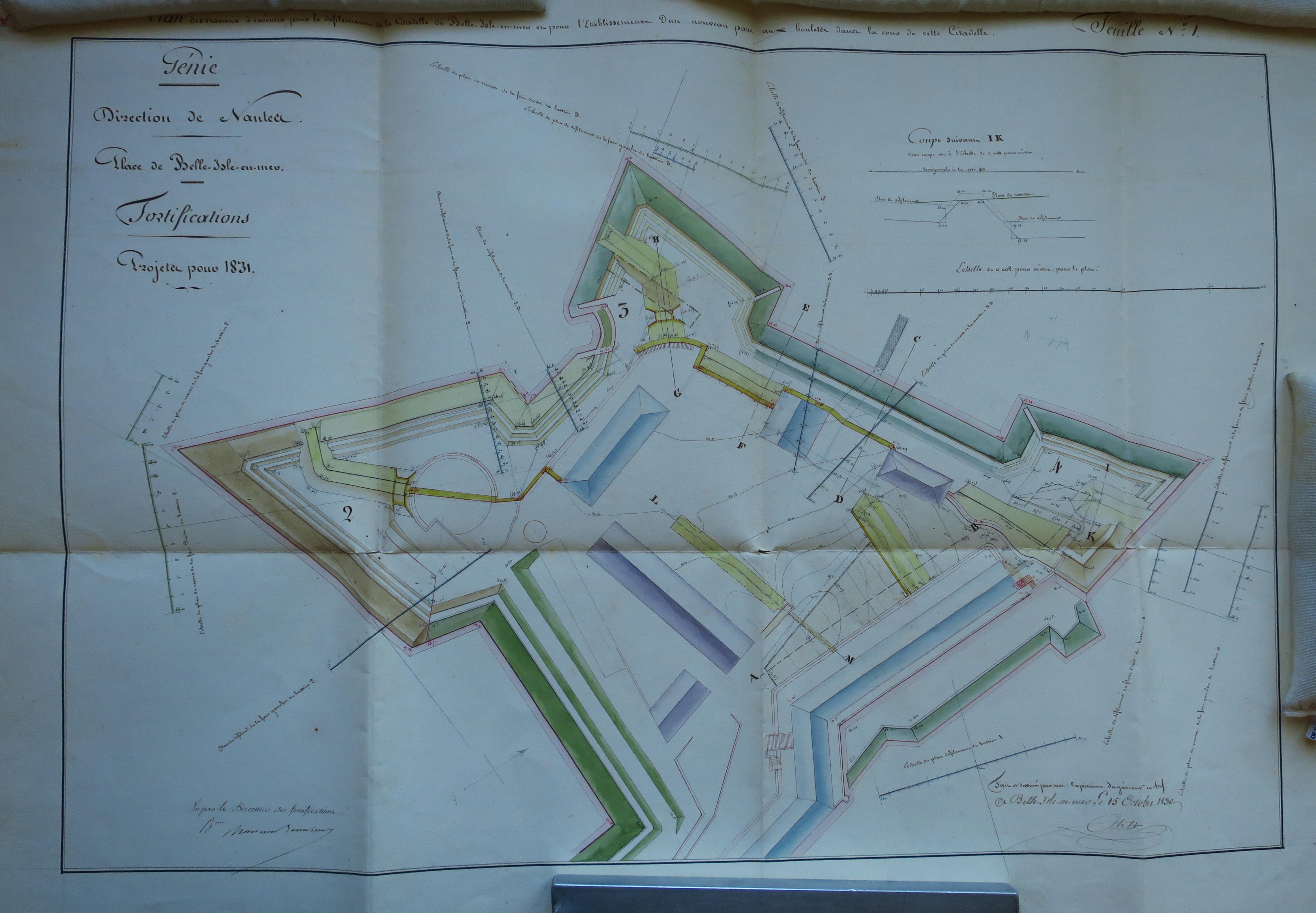 Service historique de la Défense, département Armée de Terre, Vincennes. Archives du Génie ; Article 8, Places françaises et d'Algérie : 1 VH 289, Place de Belle-Île-en-Mer, projets et dépenses annuels, 1831-1836. Direction du Génie de Nantes, Place de Belle-Ile-en-Mer, feuille n° 1 des projets pour 1831, plan des travaux à effectuer pour le défilement de la citadelle de Belle-Isle-en-Mer, 15 octobre 1830.