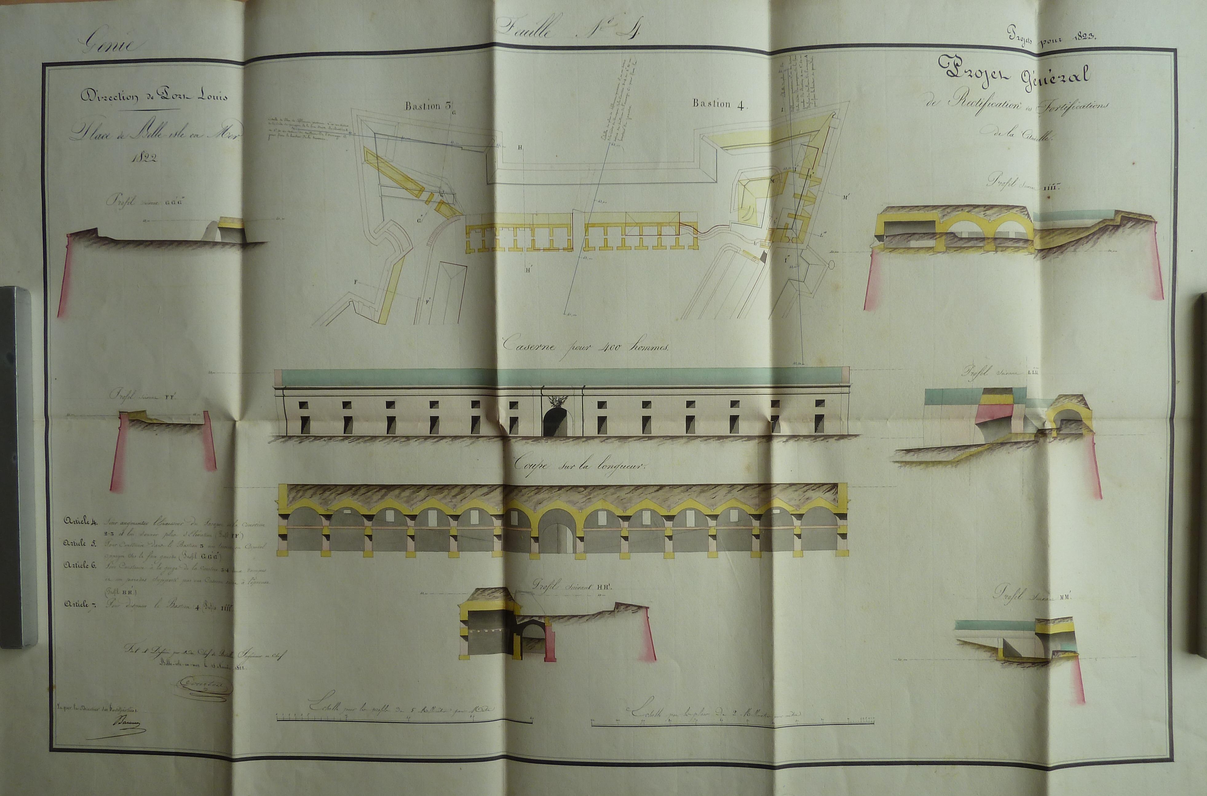 Service historique de la Défense, département Armée de Terre, Vincennes. Archives du Génie ; Article 8, Places françaises et d'Algérie : 1 VH 287, Place de Belle-Île-en-Mer, projets et dépenses annuels, 1817-1825. Direction du Génie de Port-Louis, Place de Belle-isle-en-Mer, feuille n° 4 des projets pour 1823, projet général de rectification des fortifications de la citadelle, 15 novembre 1822.
