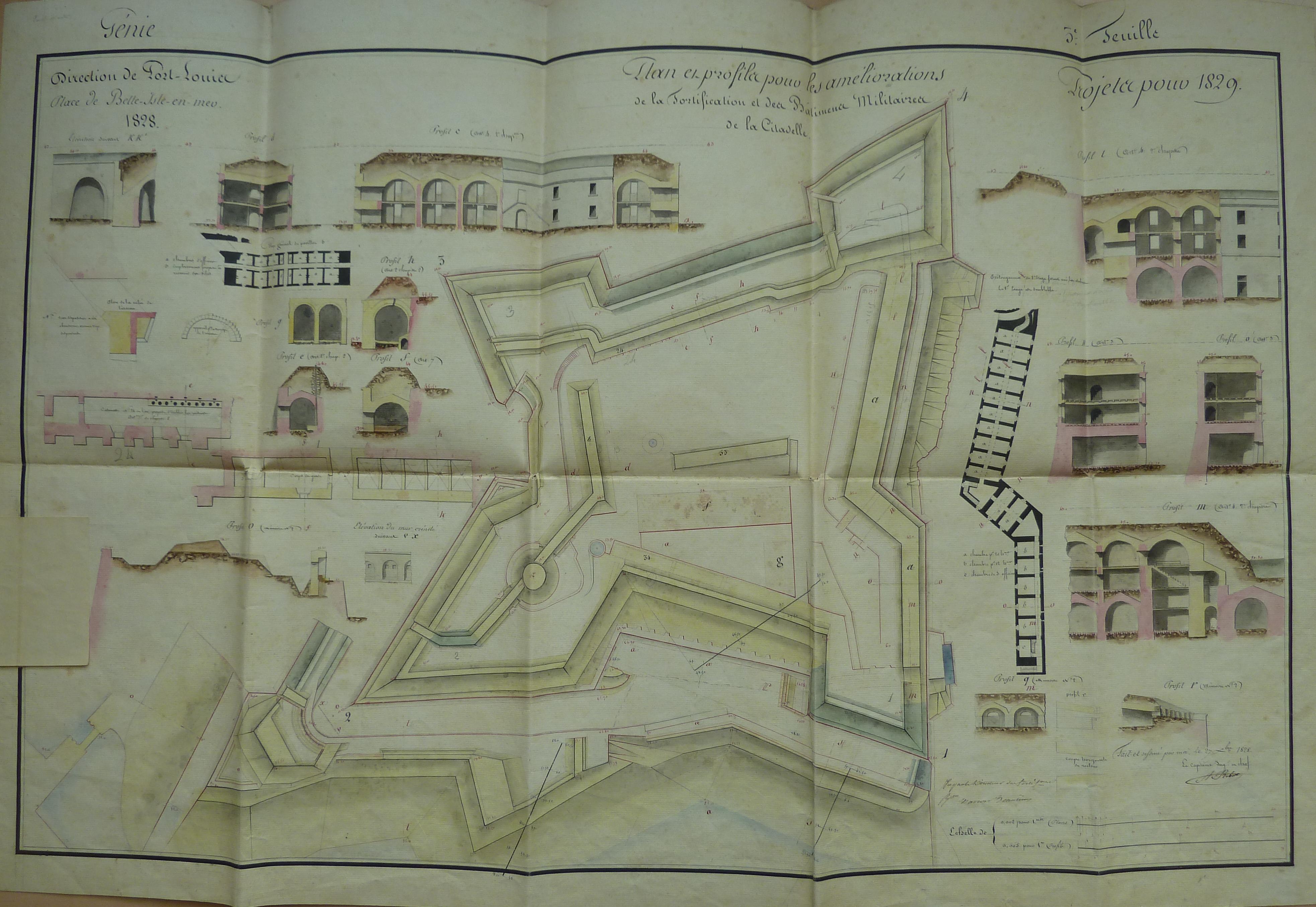 Service historique de la Défense, département Armée de Terre, Vincennes. Archives du Génie ; Article 8, Places françaises et d'Algérie : 1 VH 288, Place de Belle-Île-en-Mer, projets et dépenses annuels, 1826-1830. Direction du Génie de Port-Louis, Place de Belle-isle-en-Mer, feuille n° 3 des projets pour 1829, plan et profils pour les améliorations de la fortification et des bâtiments militaires de la citadelle, 27 décembre 1828.
