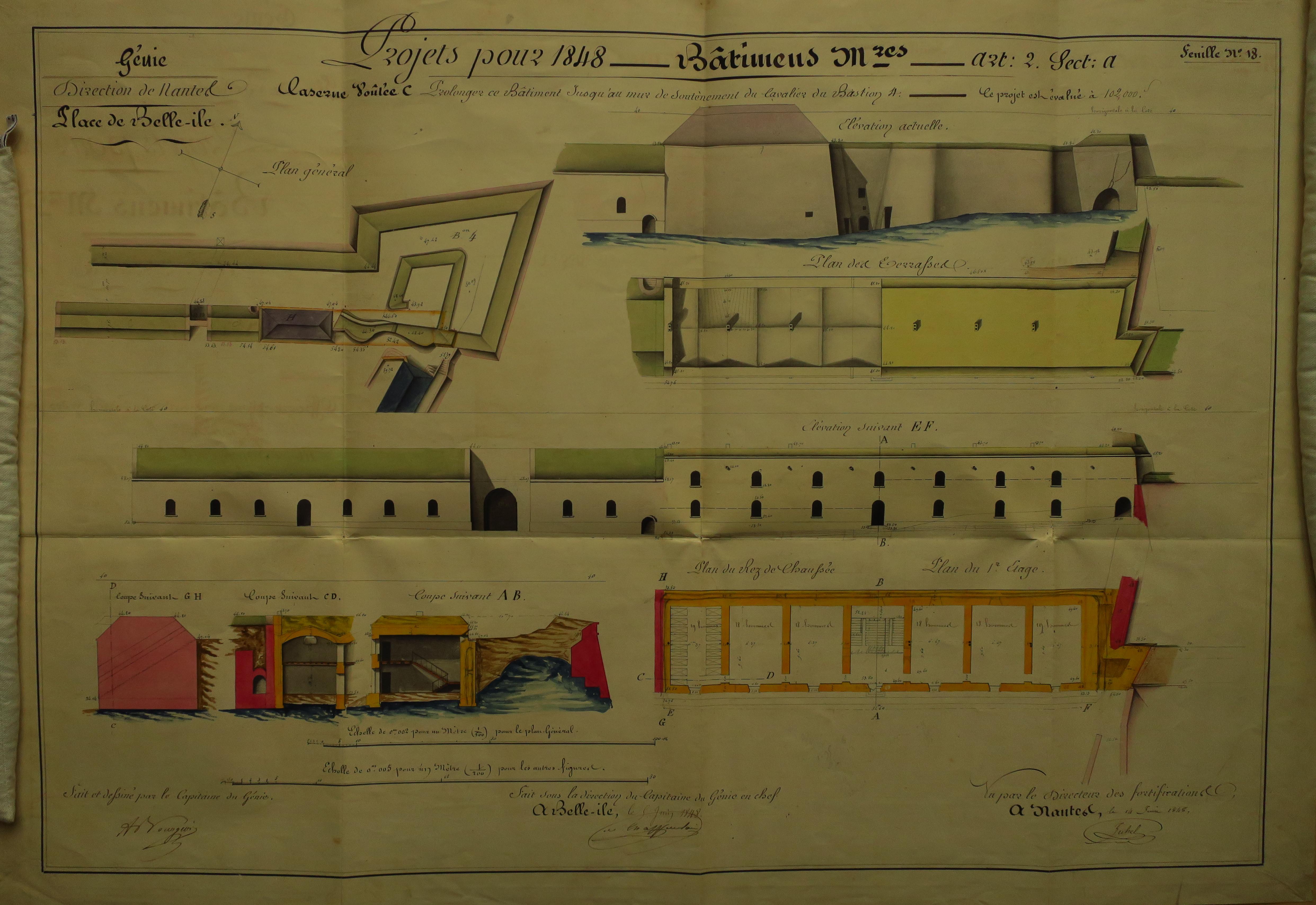 Service historique de la Défense, département Armée de Terre, Vincennes. Archives du Génie ; Article 8, Places françaises et d'Algérie : 1 VH 293, Place de Belle-Île-en-Mer, projets et dépenses annuels, 1848-1853. Direction du Génie de Nantes, Place de Belle-Ile, feuille n° 18 des projets pour 1848, prolongement de la caserne voûtée C, 5 juin 1848.
