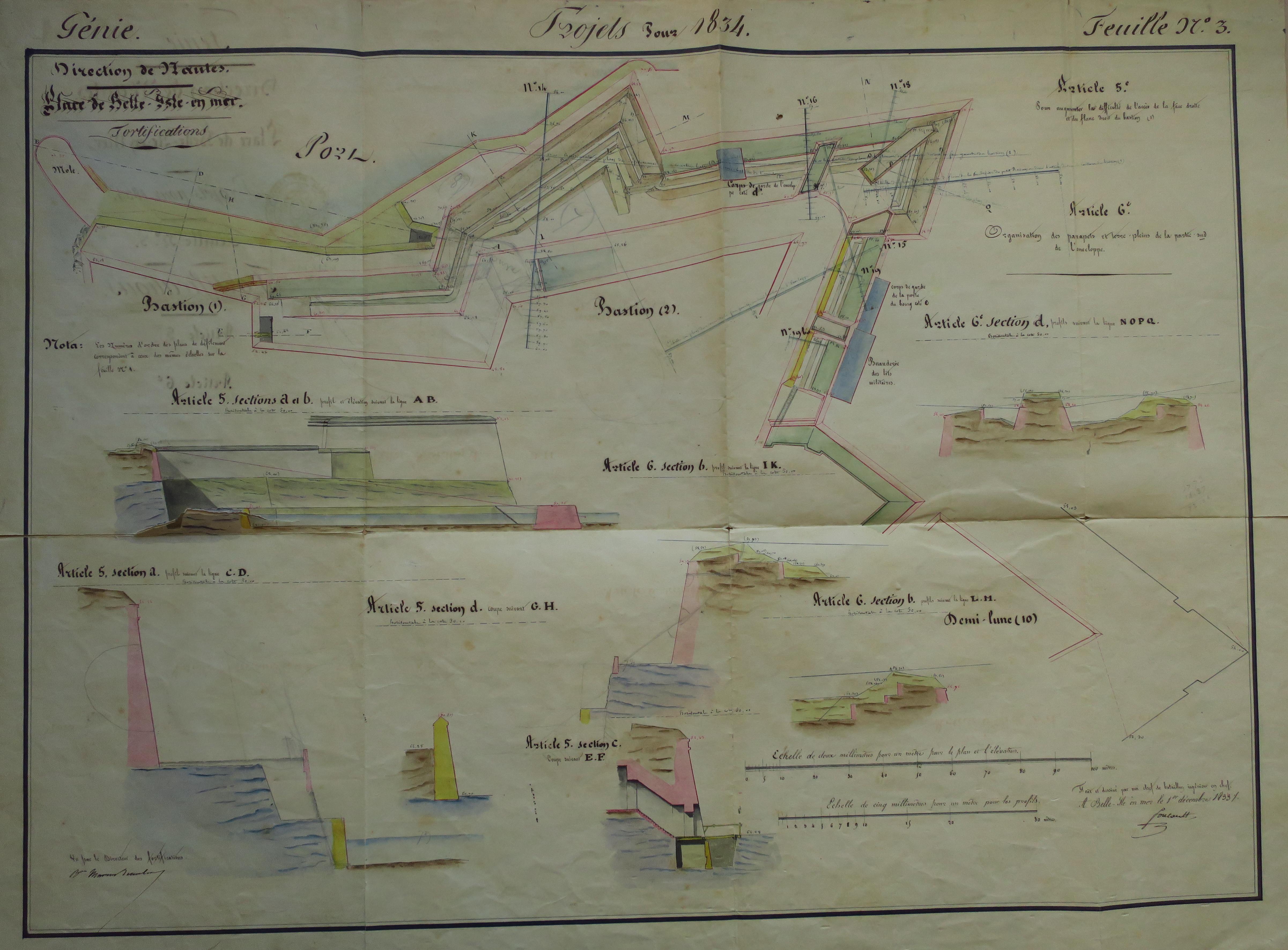 Service historique de la Défense, département Armée de Terre, Vincennes. Archives du Génie ; Article 8, Places françaises et d'Algérie : 1 VH 289, Place de Belle-Île-en-Mer, projets et dépenses annuels, 1831-1836. Direction du Génie de Nantes, Place de Belle-Isle-en-Mer, feuille n° 3 des projets pour 1834, pour augmenter la difficulté d'accès de la face droite et du flanc droit du bastion (1), 1er décembre 1833.