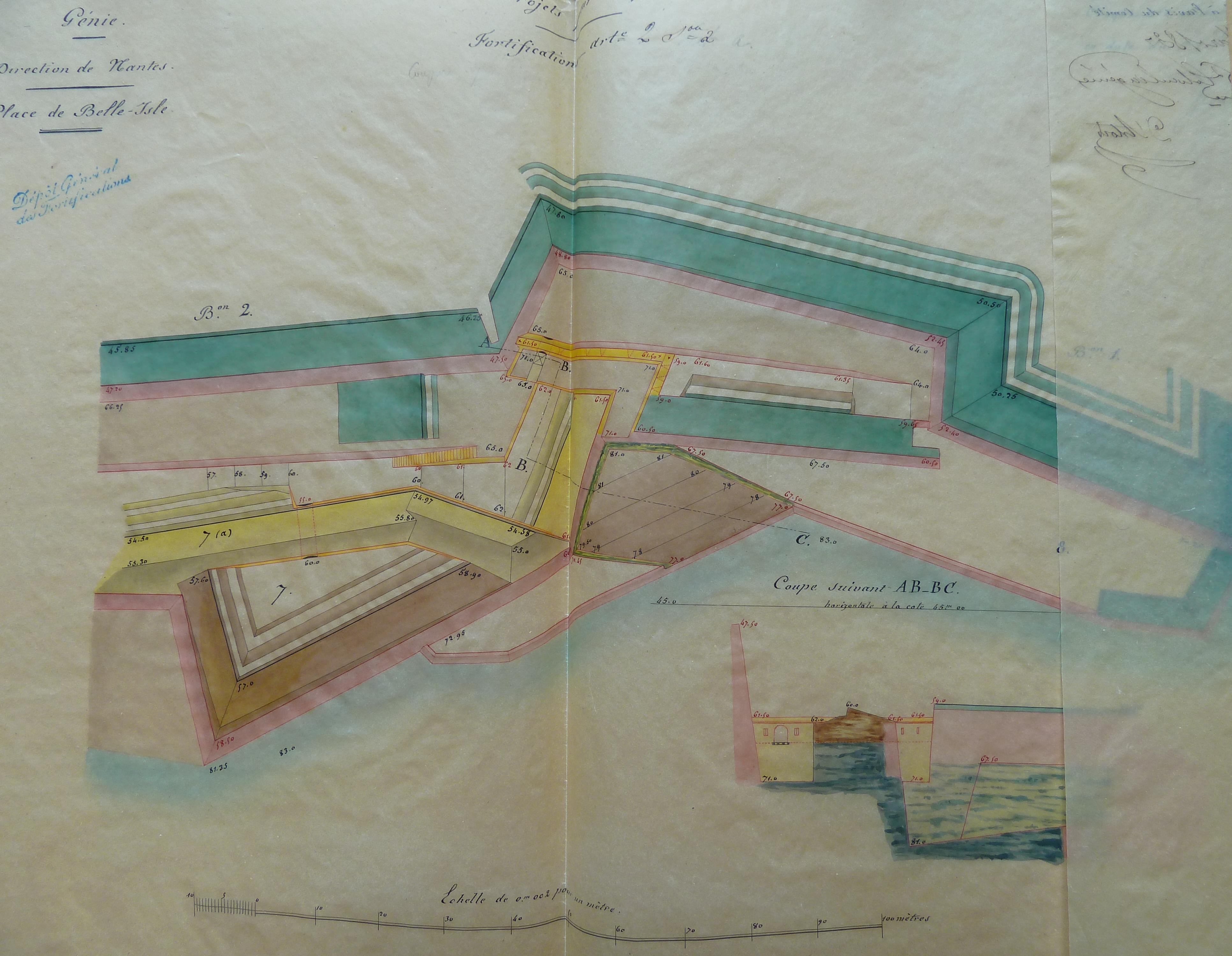 Service historique de la Défense, département Armée de Terre, Vincennes. Archives du Génie ; Article 12, Avis du Comité : 1 VK 534, Croquis annexés aux avis du Comité, Bellegarde, Belle-Île-en-Mer, Bergues (1818-1885). Direction du Génie de Nantes, Place de Belle-Ile, croquis annexé à l'avis du Comité en date du 9 mars 1837.