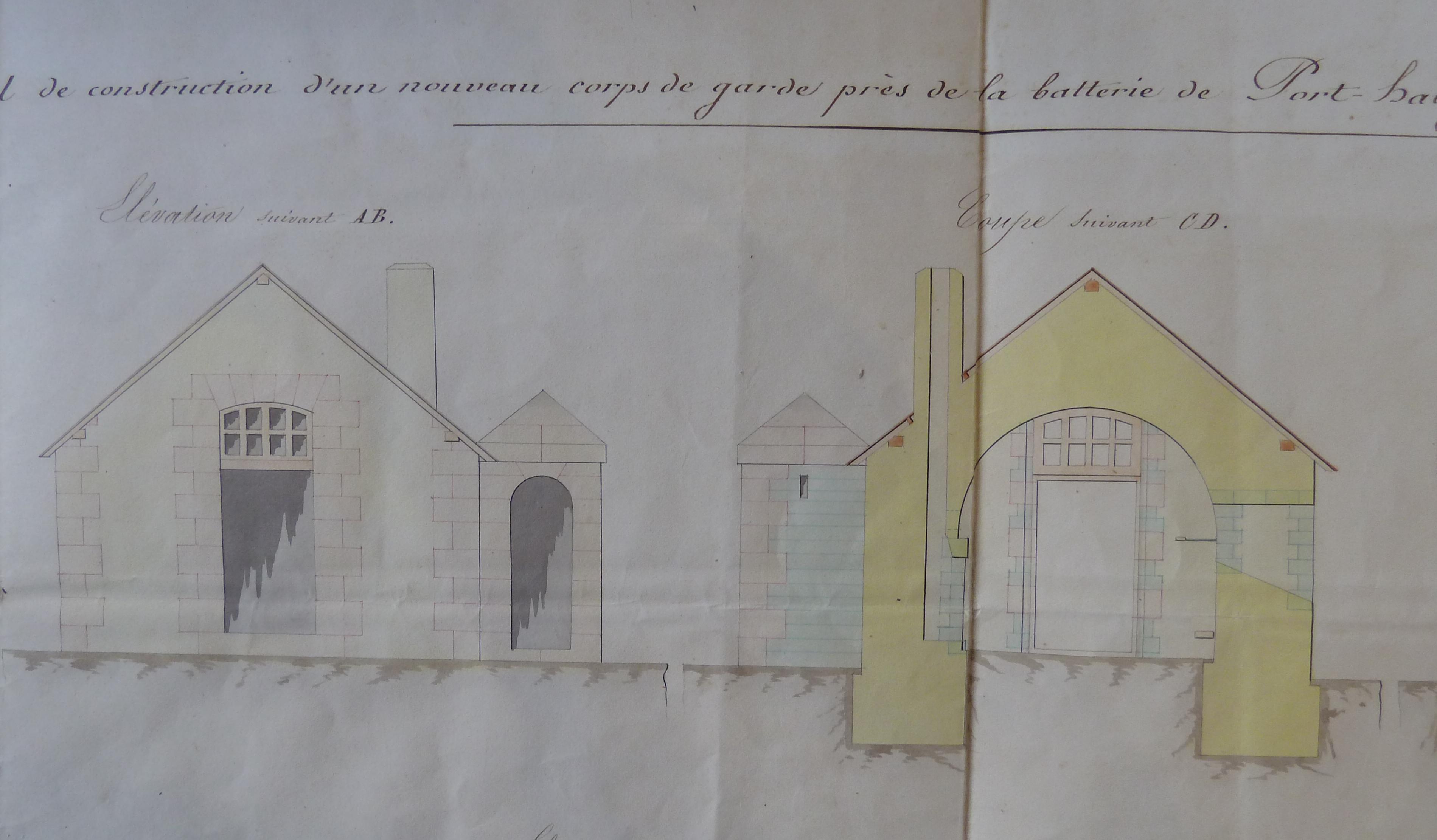Archives départementales du Morbihan. Série S, Travaux publics et transports ; sous-série 4 S, mer, ports, transport maritime : 4 S 1290, Port Haliguen, 1770-1939. Direction du Génie de Nantes, Place de Quiberon, Projet de construction d'un nouveau corps de garde près de la batterie de Port Haliguen, 30 janvier 1844.