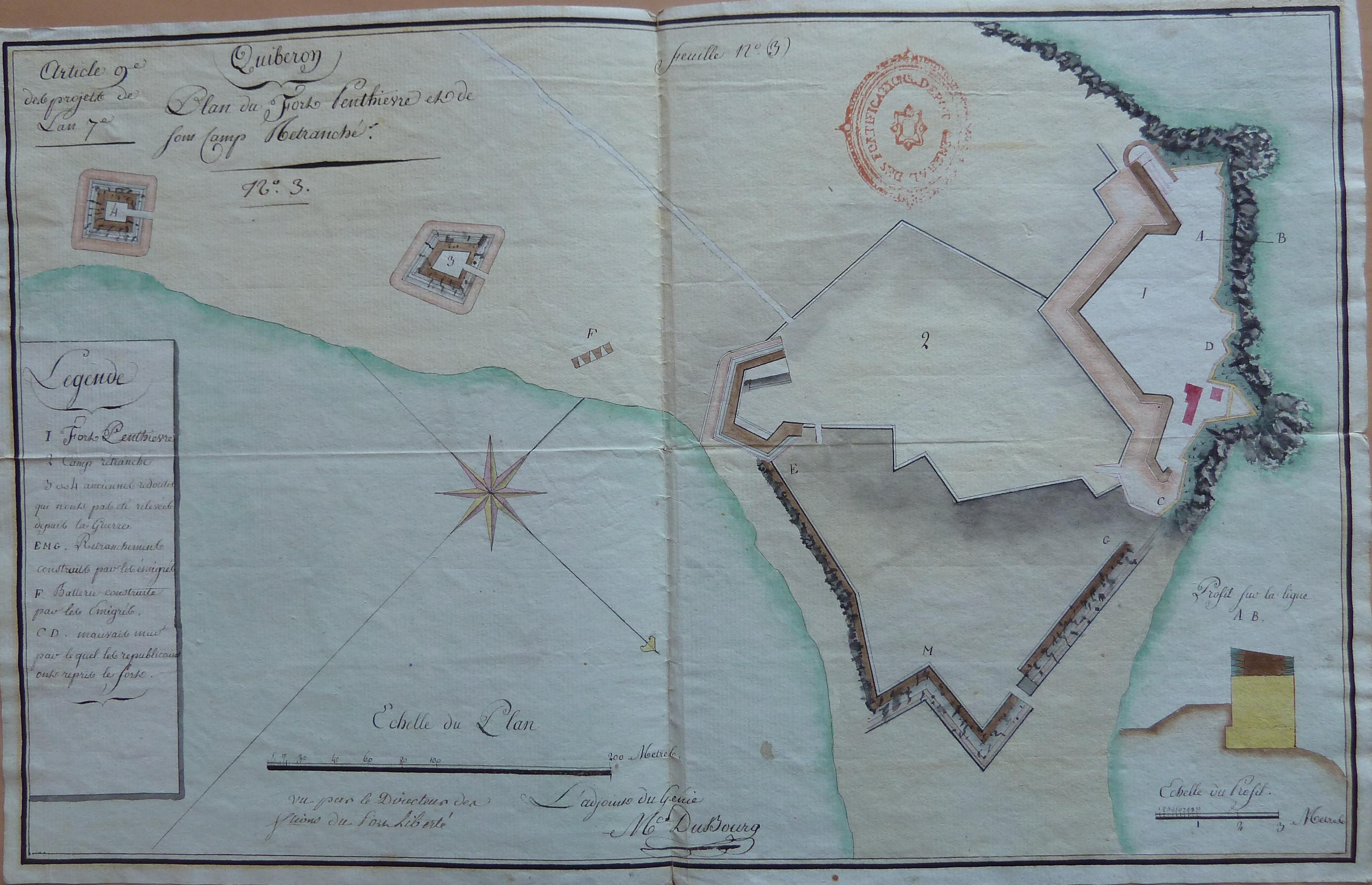 Service historique de la Défense, département Armée de Terre, Vincennes. Archives du Génie ; Article 8, Places françaises et d'Algérie : 1 VH 1515, Place de Quiberon, projets et dépenses annuels, 1747-1822. Quiberon, projets de l'an 7e [1798-1799], plan du fort Penthièvre et de son camp retranché.