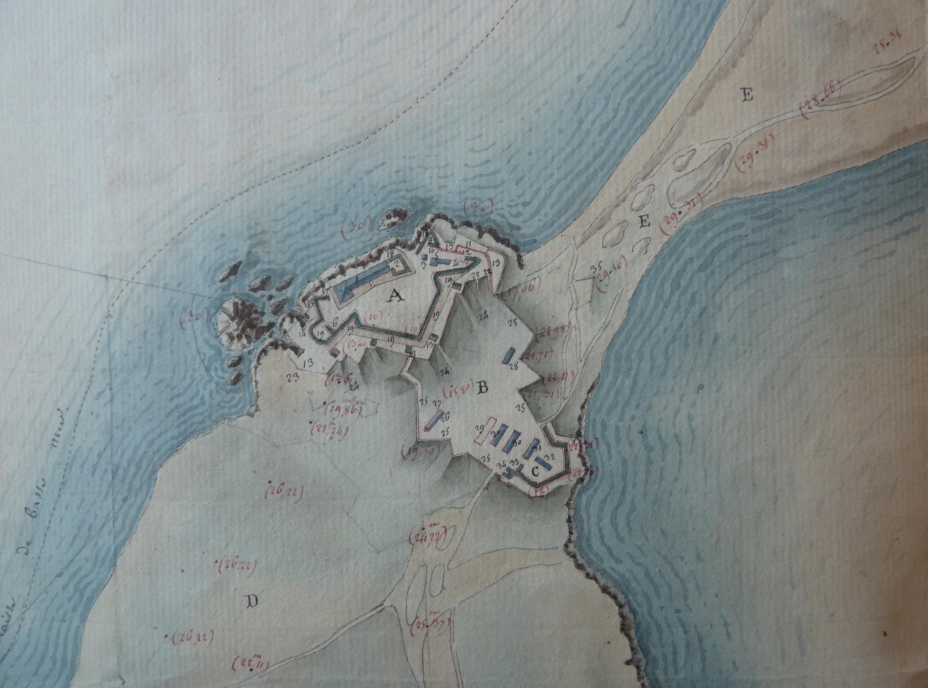 Service historique de la Défense, département Armée de Terre, Vincennes. Archives du Génie ; Article 8, Places françaises et d'Algérie : 1 VH 1515, Place de Quiberon, projets et dépenses annuels, 1747-1822. Direction du Génie de Port-Louis, Poste de Quiberon, feuille n° 1 des projets pour 1811, plan général du fort Penthièvre de Quiberon et de ses environs, 1810.