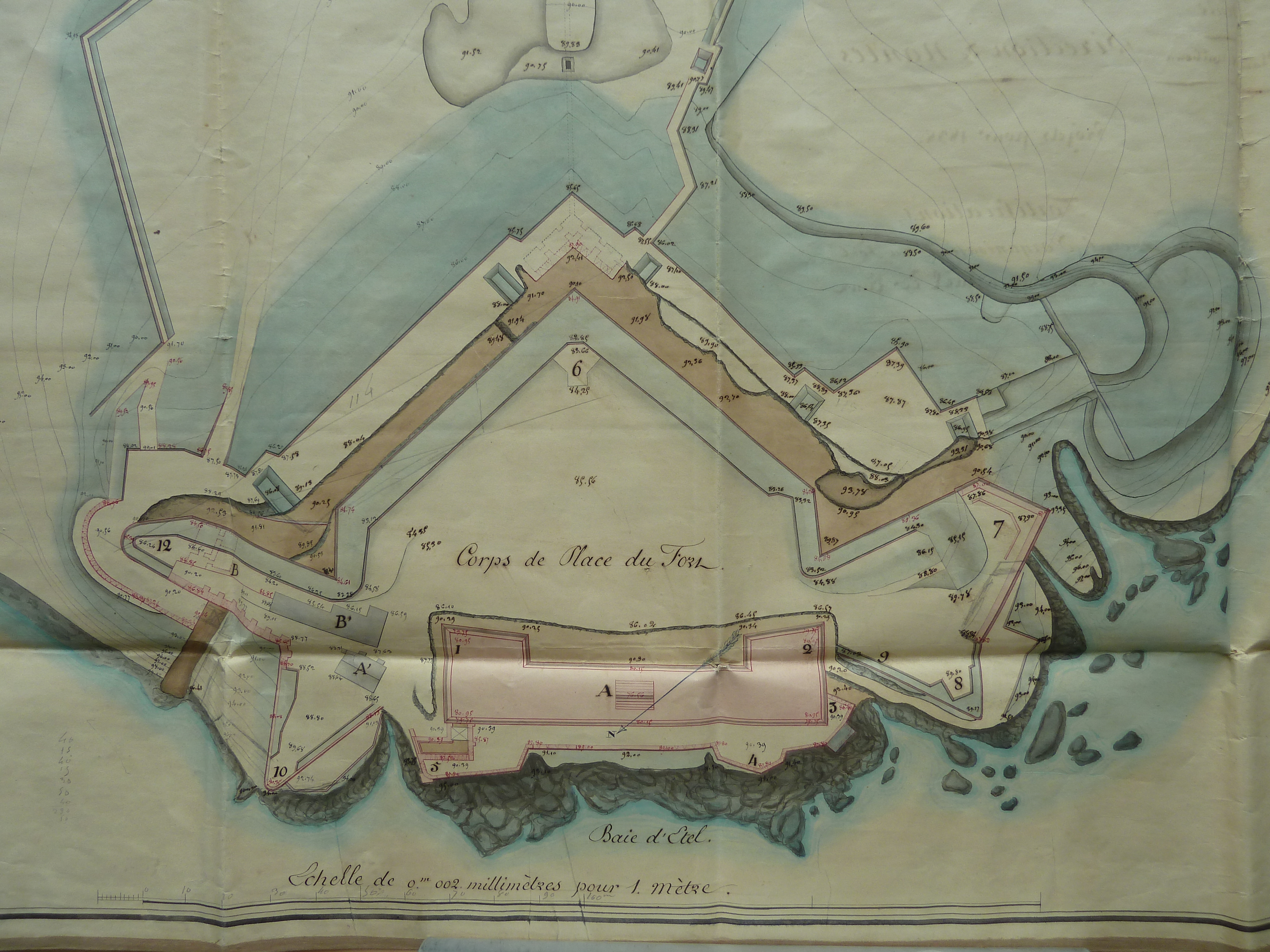 Service historique de la Défense, département Armée de Terre, Vincennes. Archives du Génie ; Article 8, Places françaises et d'Algérie : 1 VH 2069, Collections de plans, Quiberon à Rocroi. Direction du Génie de Nantes, Place de Quiberon, feuille n° 2 des projets pour 1838, projet général d'organisation du fort Penthièvre, état actuel, 27 janvier 1838.