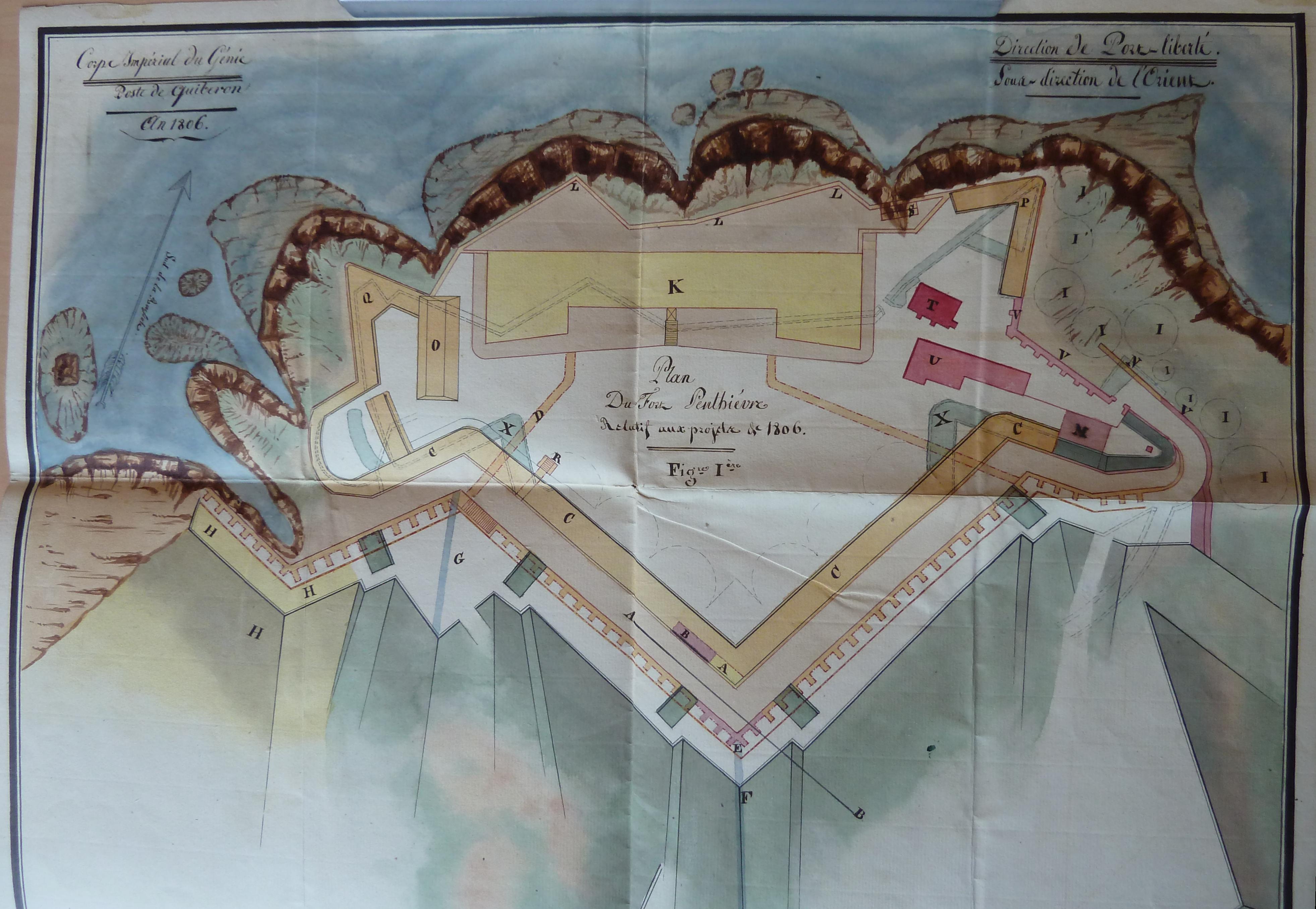 Service historique de la Défense, département Armée de Terre, Vincennes. Archives du Génie ; Article 8, Places françaises et d'Algérie : 1 VH 1515, Place de Quiberon, projets et dépenses annuels, 1747-1822. Direction du Génie de Port-Liberté, Poste de Quiberon, plan du fort Penthièvre relatif aux projets de 1806, juin 1806.