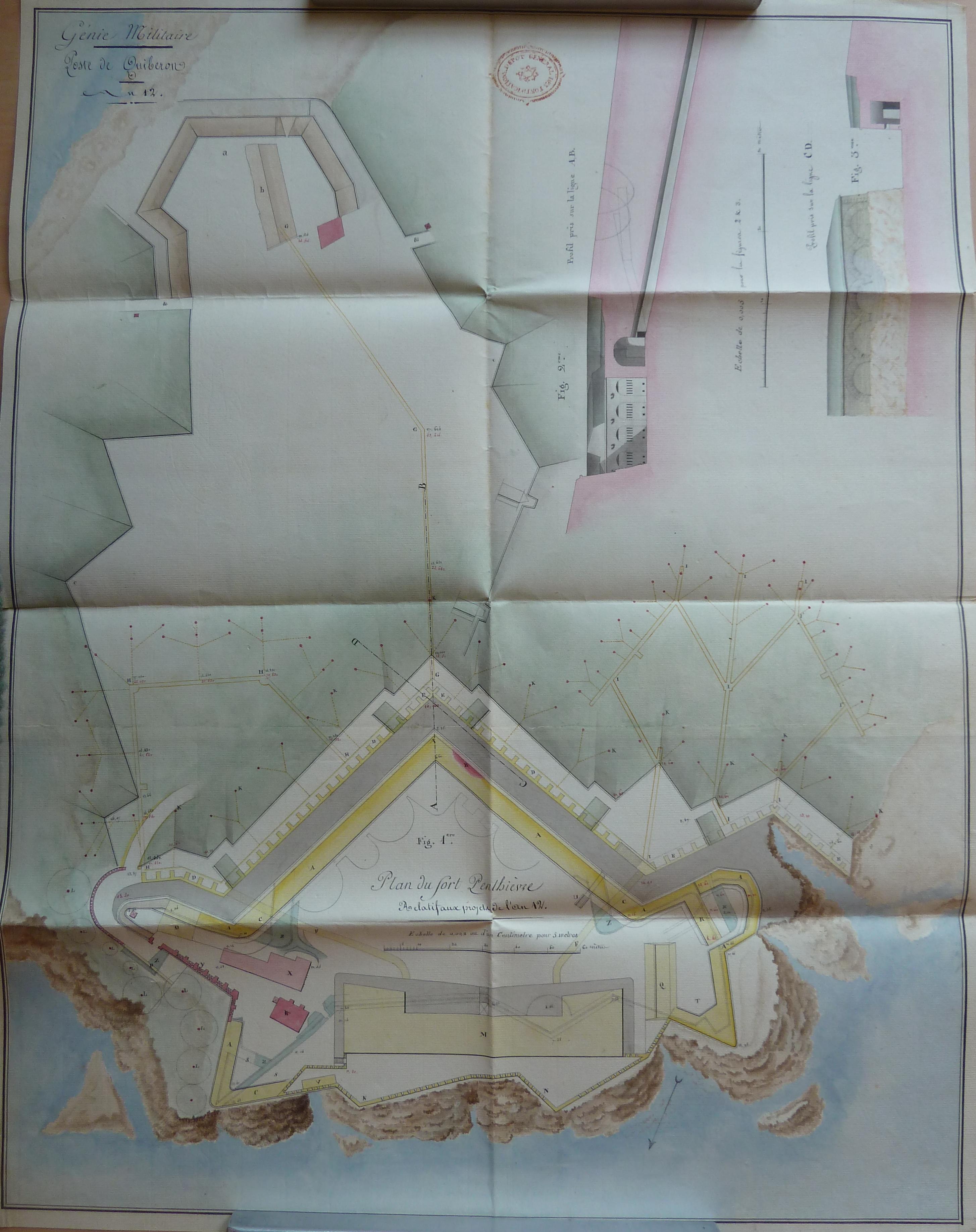 Service historique de la Défense, département Armée de Terre, Vincennes. Archives du Génie ; Article 8, Places françaises et d'Algérie : 1 VH 1515, Place de Quiberon, projets et dépenses annuels, 1747-1822. Poste de Quiberon, plan du fort Penthièvre relatif aux projets de l'an 12 [1803-1804].