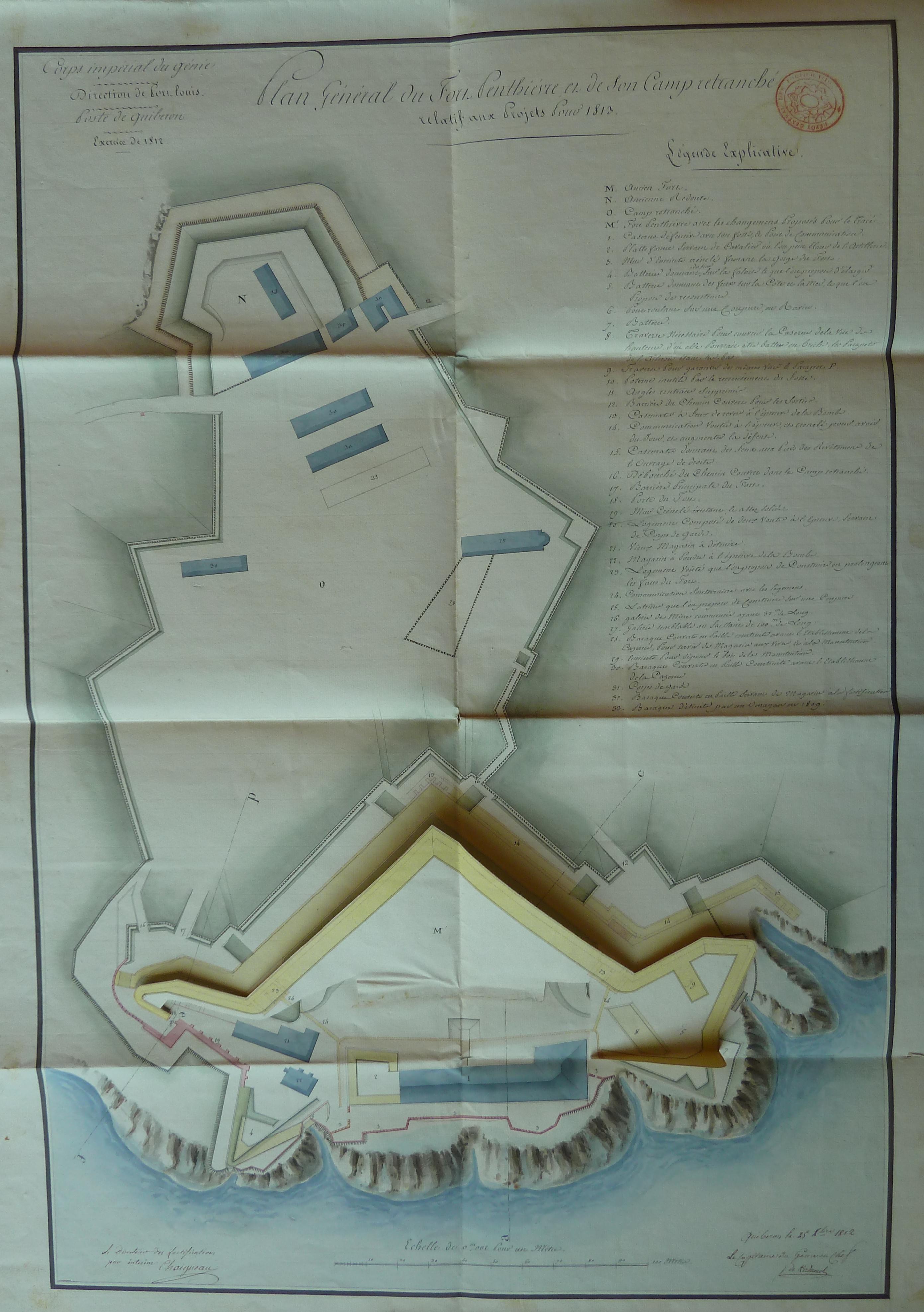 Service historique de la Défense, département Armée de Terre, Vincennes. Archives du Génie ; Article 8, Places françaises et d'Algérie : 1 VH 1515, Place de Quiberon, projets et dépenses annuels, 1747-1822. Direction du Génie de Port-Louis, Poste de Quiberon, plan du fort Penthièvre et de son camp retranché relatif aux projets pour 1813, 25 décembre 1812.