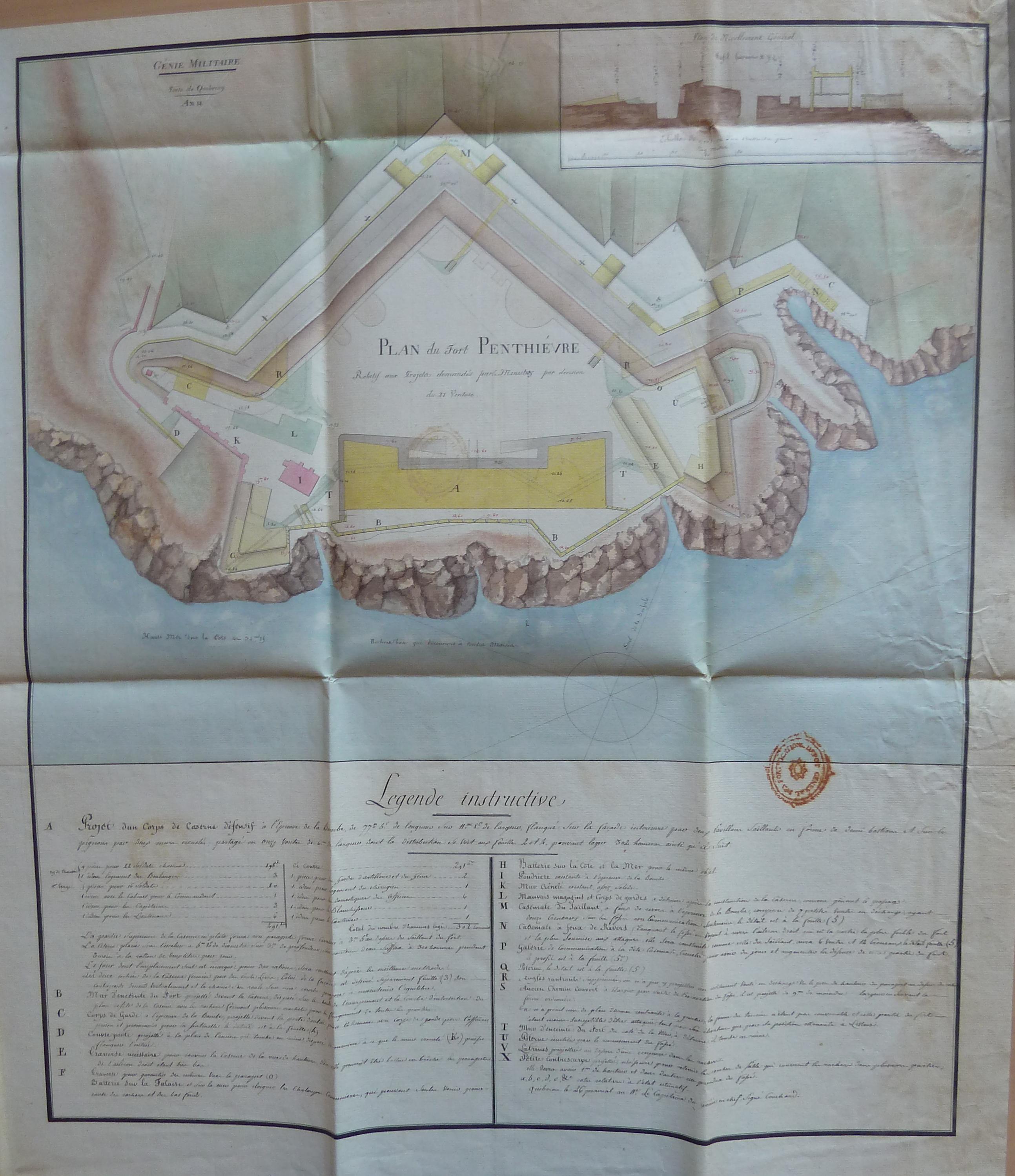 Service historique de la Défense, département Armée de Terre, Vincennes. Archives du Génie ; Article 8, Places françaises et d'Algérie : 1 VH 1515, Place de Quiberon, projets et dépenses annuels, 1747-1822. Poste de Quiberon, an 12 [1803-1804], plan du fort Penthièvre relatif aux projets demandés par le Ministre par décision du 21 ventôse.