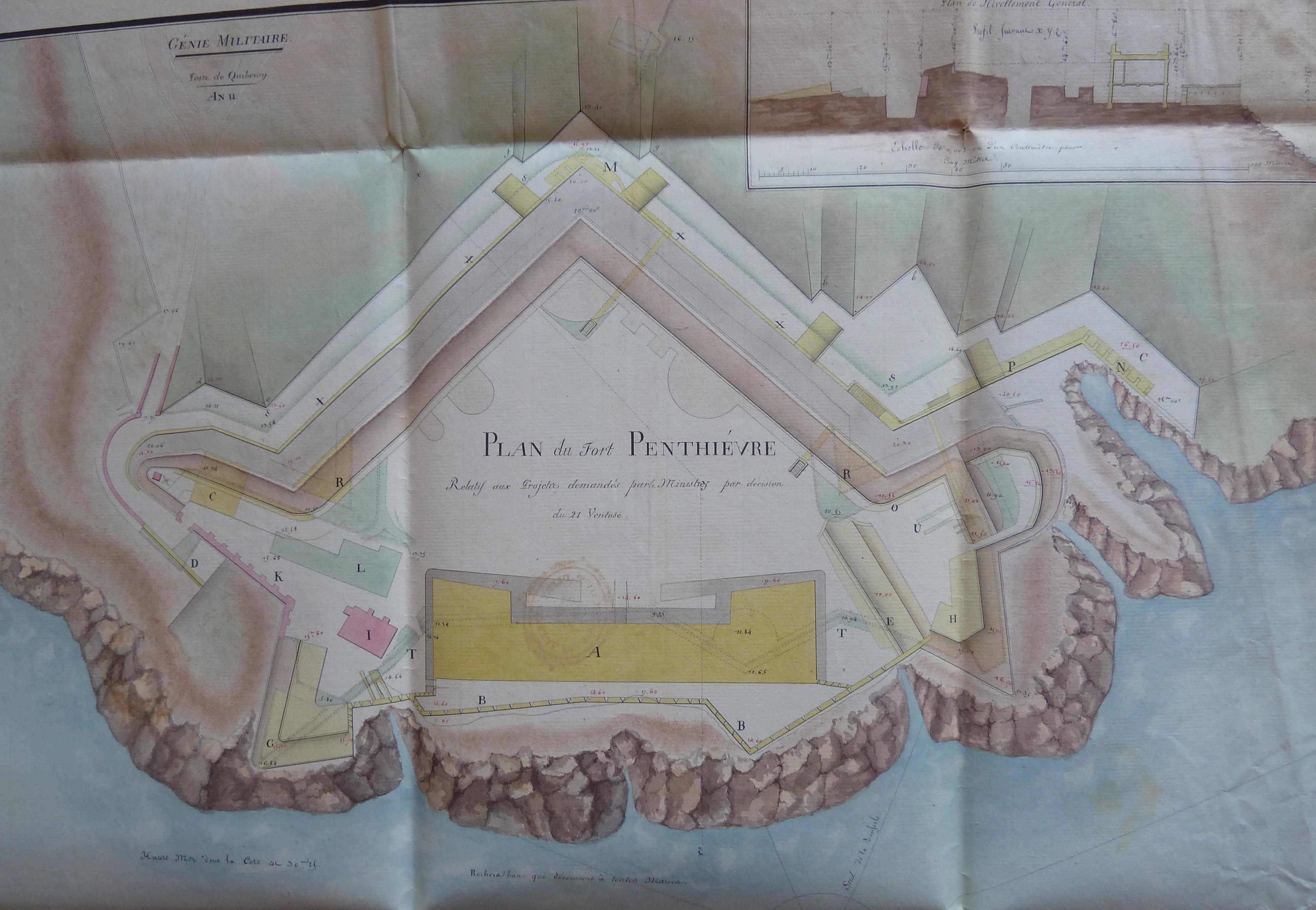 Service historique de la Défense, département Armée de Terre, Vincennes. Archives du Génie ; Article 8, Places françaises et d'Algérie : 1 VH 1515, Place de Quiberon, projets et dépenses annuels, 1747-1822. Poste de Quiberon, an 12 [1803-1804], plan du fort Penthièvre relatif aux projets demandés par le Ministre par décision du 21 ventôse.