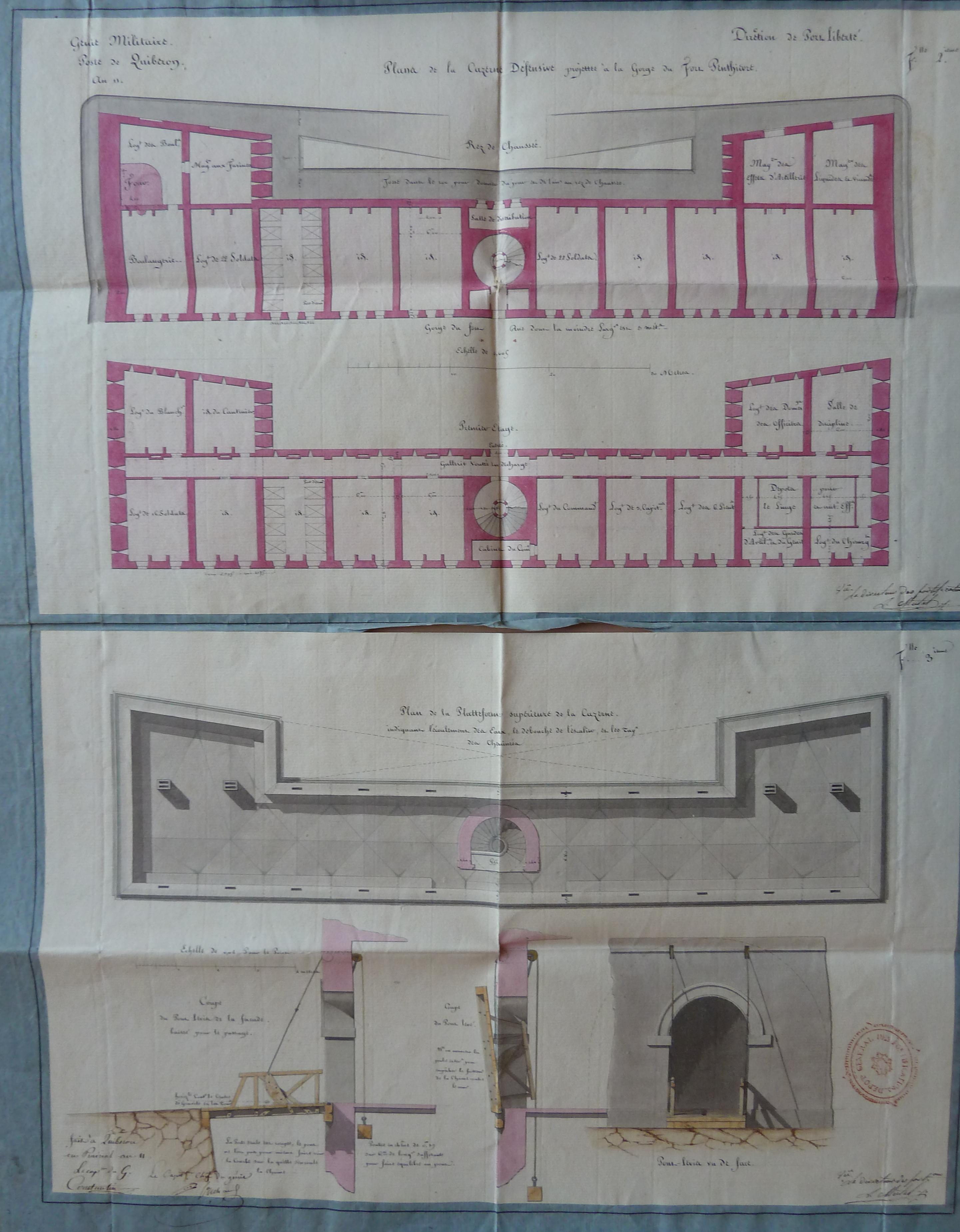 Service historique de la Défense, département Armée de Terre, Vincennes. Archives du Génie ; Article 8, Places françaises et d'Algérie : 1 VH 1515, Place de Quiberon, projets et dépenses annuels, 1747-1822. Direction du Génie de Port-Liberté, Poste de Quiberon, an 11 [1802-1803], plans de la caserne défensive projettée à la gorge du fort Penthièvre, prairial an 11 [mai-juin 1803].