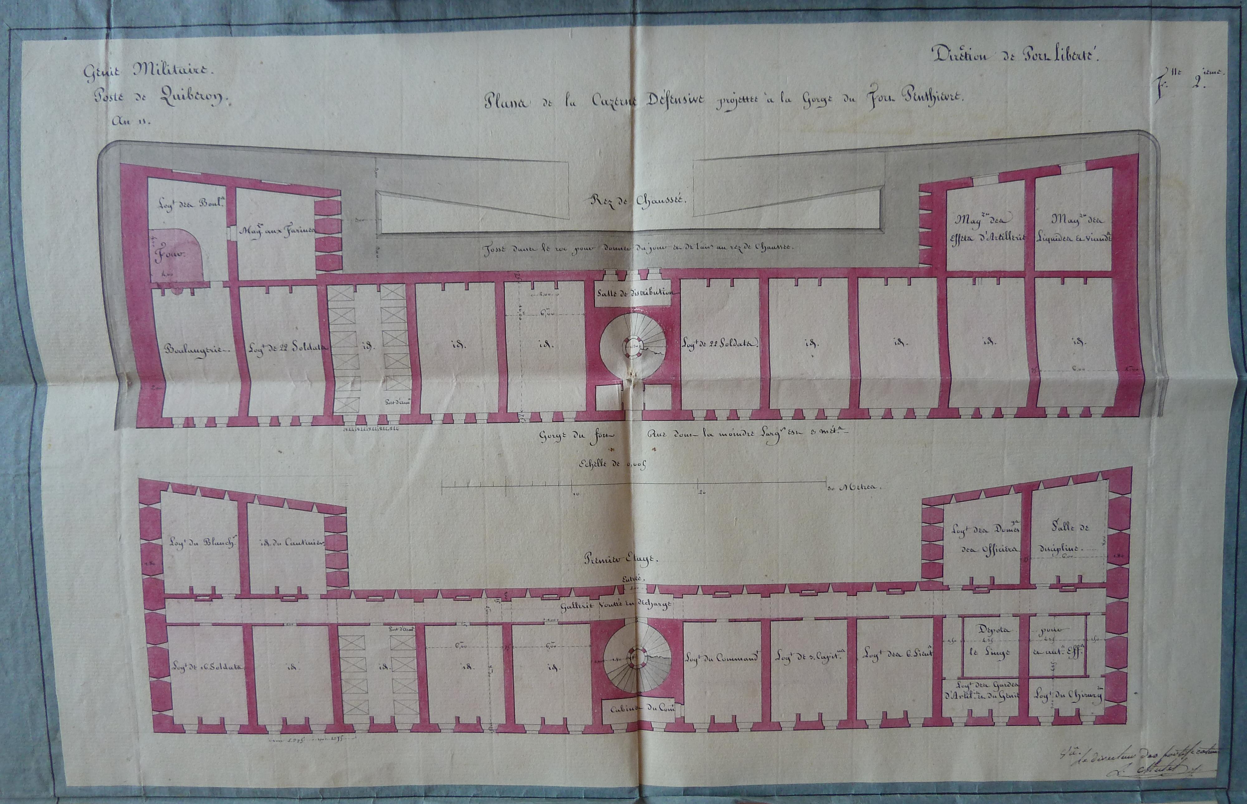 Service historique de la Défense, département Armée de Terre, Vincennes. Archives du Génie ; Article 8, Places françaises et d'Algérie : 1 VH 1515, Place de Quiberon, projets et dépenses annuels, 1747-1822. Direction du Génie de Port-Liberté, Poste de Quiberon, an 11 [1802-1803], plans de la caserne défensive projettée à la gorge du fort Penthièvre, prairial an 11 [mai-juin 1803].