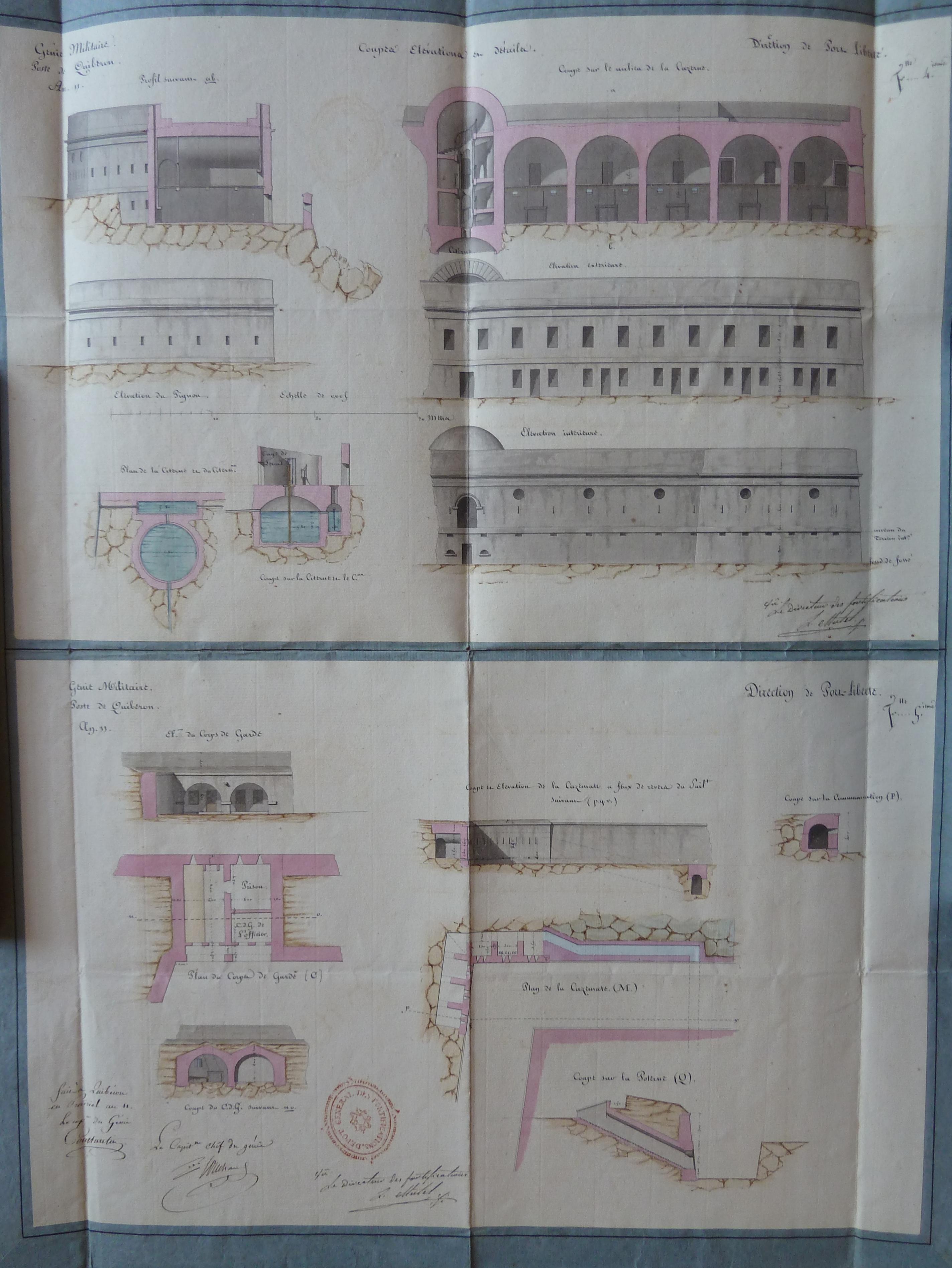 Service historique de la Défense, département Armée de Terre, Vincennes. Archives du Génie ; Article 8, Places françaises et d'Algérie : 1 VH 1515, Place de Quiberon, projets et dépenses annuels, 1747-1822. Direction du Génie de Port-Liberté, Poste de Quiberon, an 11 [1802-1803], élévations, coupes et plans de la caserne, des casemates à feux de revers, du corps de garde à construire au fort Penthièvre d'après la décision du ministre du 21 ventôse an 11 [13 mars 1803].