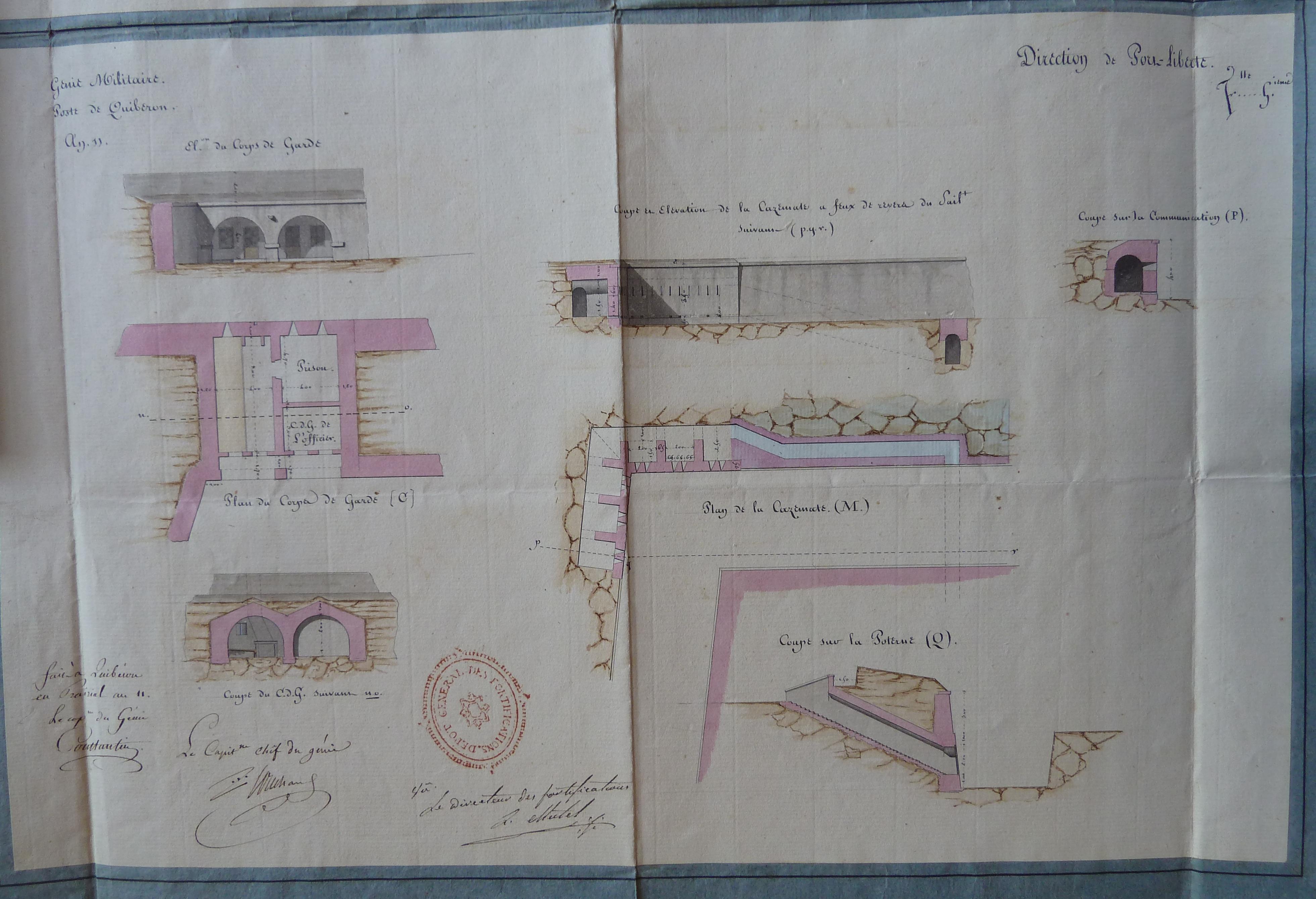 Service historique de la Défense, département Armée de Terre, Vincennes. Archives du Génie ; Article 8, Places françaises et d'Algérie : 1 VH 1515, Place de Quiberon, projets et dépenses annuels, 1747-1822. Direction du Génie de Port-Liberté, Poste de Quiberon, an 11 [1802-1803], élévations, coupes et plans de la caserne, des casemates à feux de revers, du corps de garde à construire au fort Penthièvre d'après la décision du ministre du 21 ventôse an 11 [13 mars 1803].