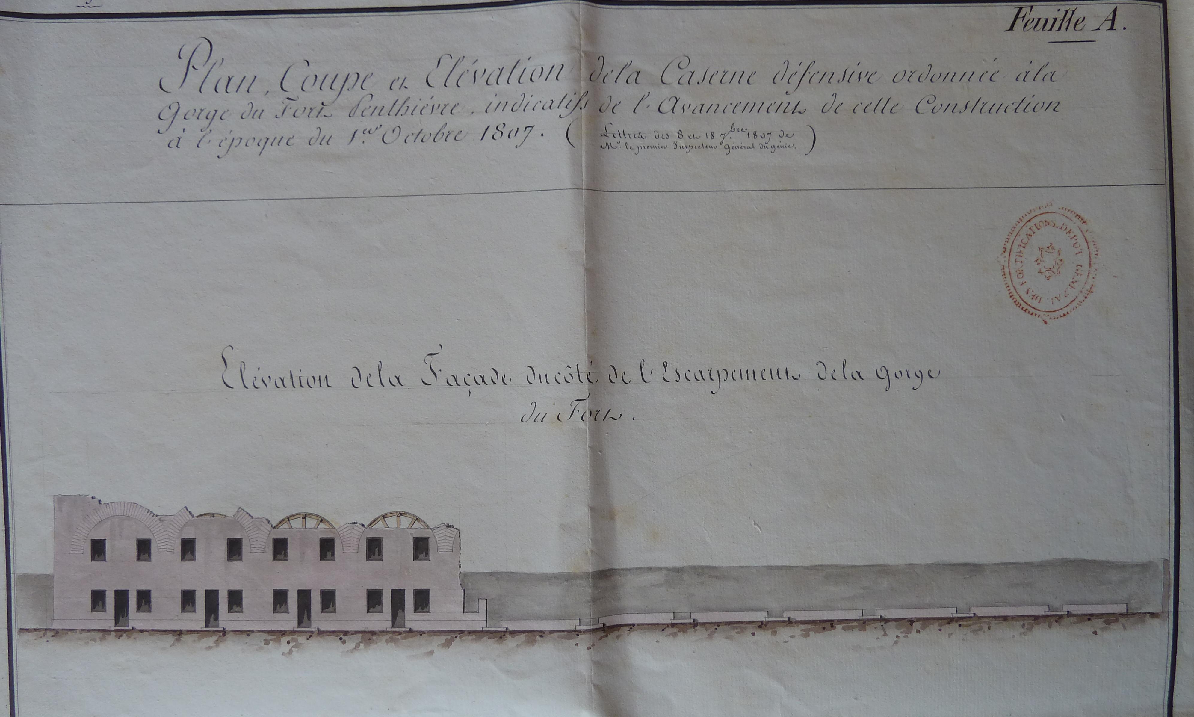 Service historique de la Défense, département Armée de Terre, Vincennes. Archives du Génie ; Article 8, Places françaises et d'Algérie : 1 VH 1515, Place de Quiberon, projets et dépenses annuels, 1747-1822. Direction du Génie de Port-Liberté, Poste de Quiberon, plan, coupe et élévation de la caserne défensive ordonnée à la gorge du fort Penthièvre, indicatifs de l'avancement de cette construction à l'époque du 1er octobre 1807.