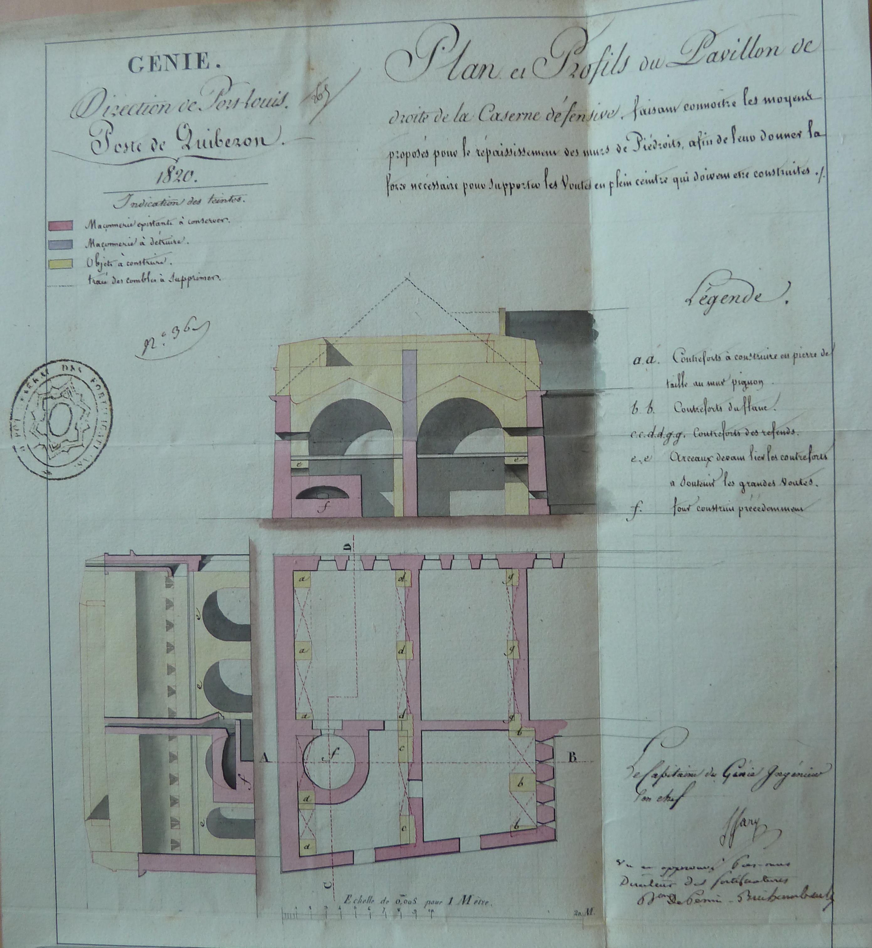 Service historique de la Défense, département Armée de Terre, Vincennes. Archives du Génie ; Article 8, Places françaises et d'Algérie : 1 VH 1515, Place de Quiberon, projets et dépenses annuels, 1747-1822. Direction du Génie de Port-Louis, Poste de Quiberon, 1820, plans et profils du pavillon de droite de la caserne défensive.