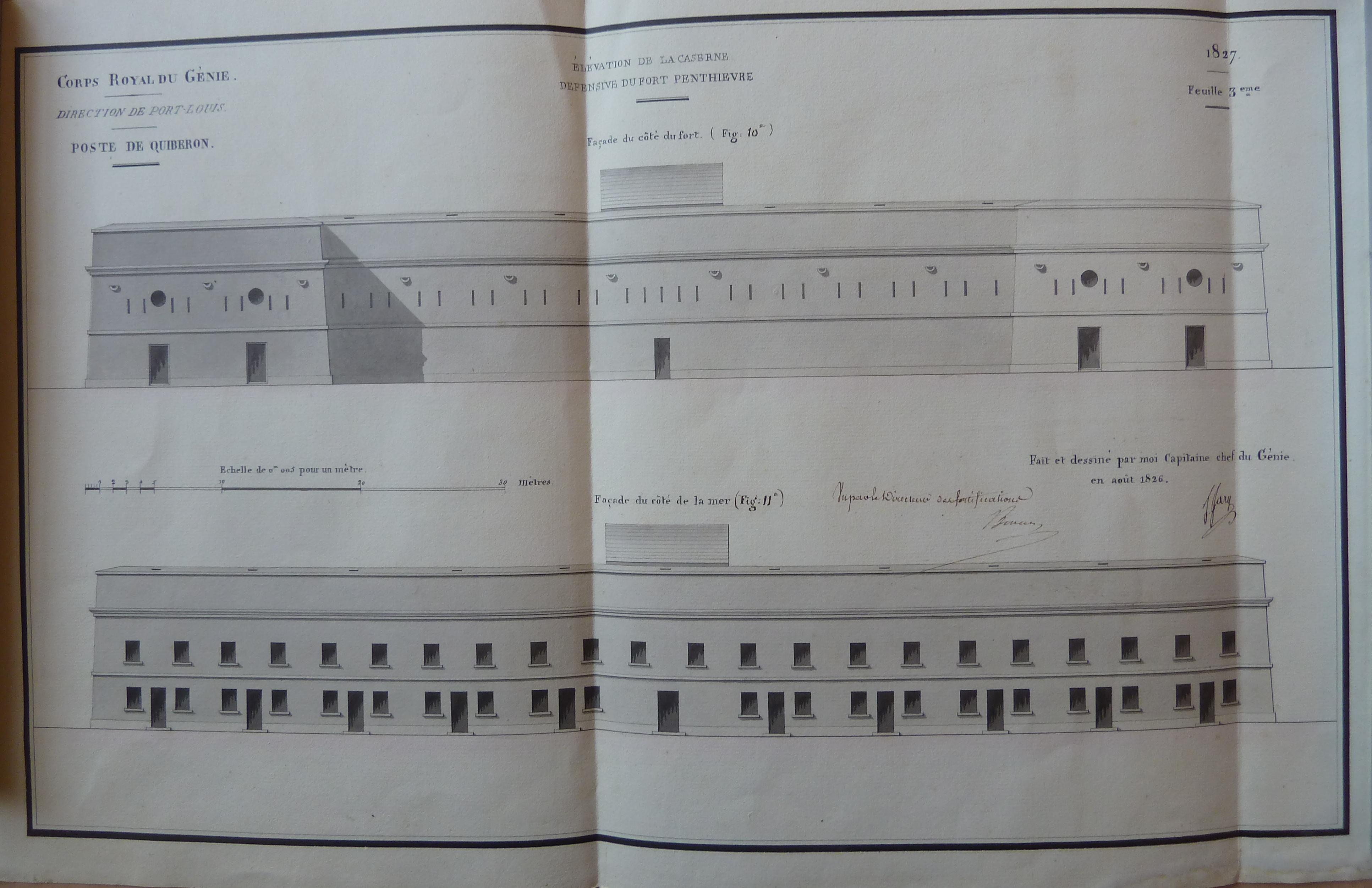 Service historique de la Défense, département Armée de Terre, Vincennes. Archives du Génie ; Article 8, Places françaises et d'Algérie : 1 VH 1516, Place de Quiberon, projets et dépenses annuels, 1823-1837. Direction du Génie de Port-Louis, Poste de Quiberon, feuille n° 3 des projets pour 1827, élévation de la caserne défensive du fort Penthièvre, août 1826.