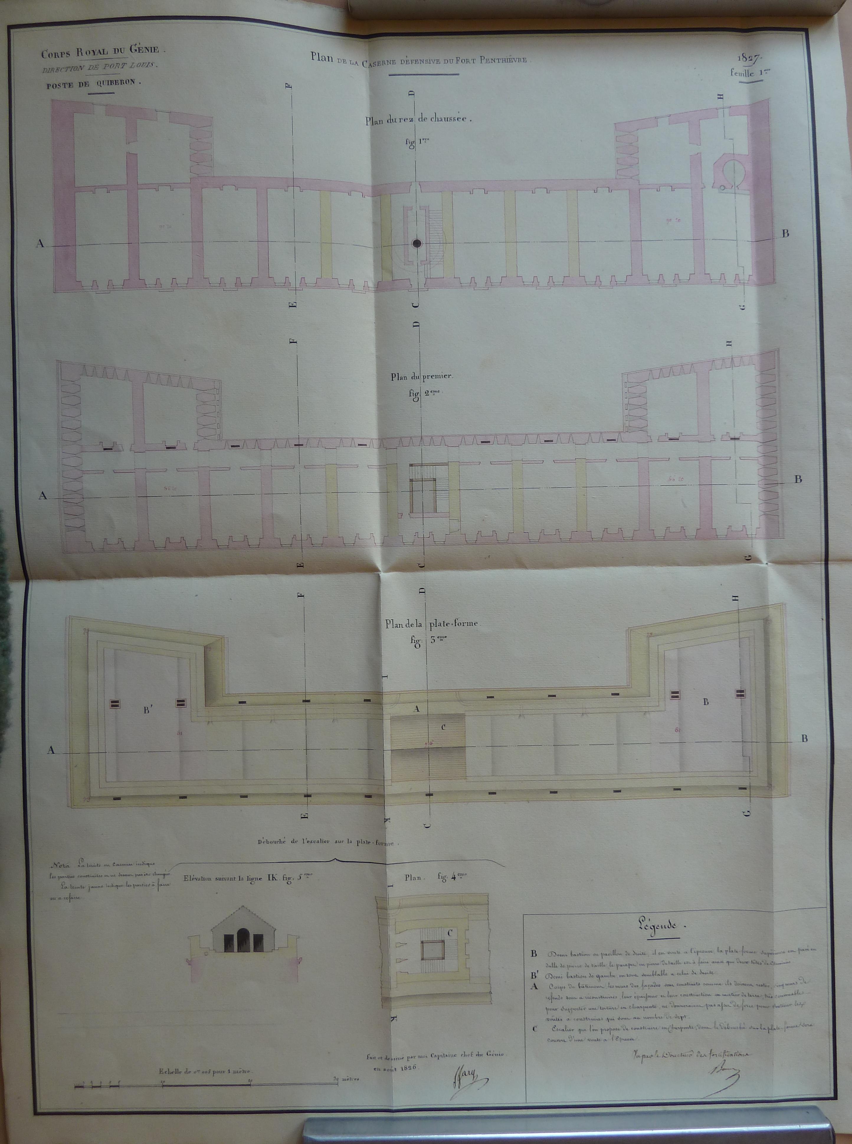 Service historique de la Défense, département Armée de Terre, Vincennes. Archives du Génie ; Article 8, Places françaises et d'Algérie : 1 VH 1516, Place de Quiberon, projets et dépenses annuels, 1823-1837. Direction du Génie de Port-Louis, Poste de Quiberon, feuille n° 1 des projets pour 1827, plan de la caserne défensive du fort Penthièvre, août 1826.