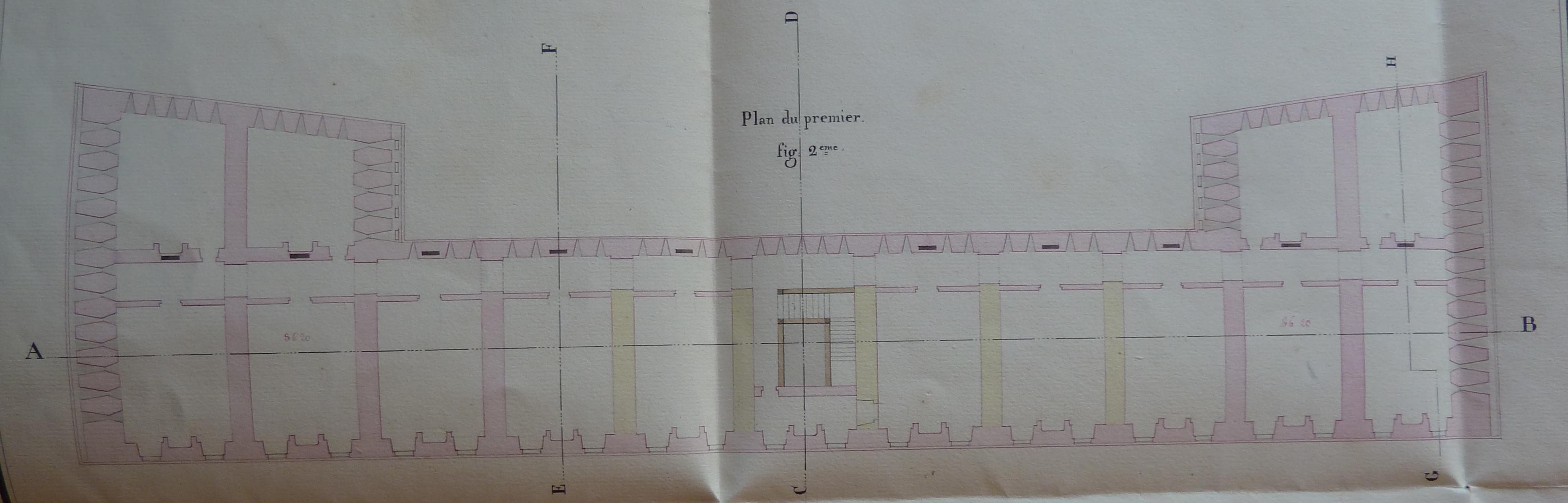 1 VH 1516. Direction du Génie de Port-Louis, Poste de Quiberon, feuille n° 1 des projets pour 1827, plan de la caserne défensive du fort Penthièvre, août 1826.Immatriculation