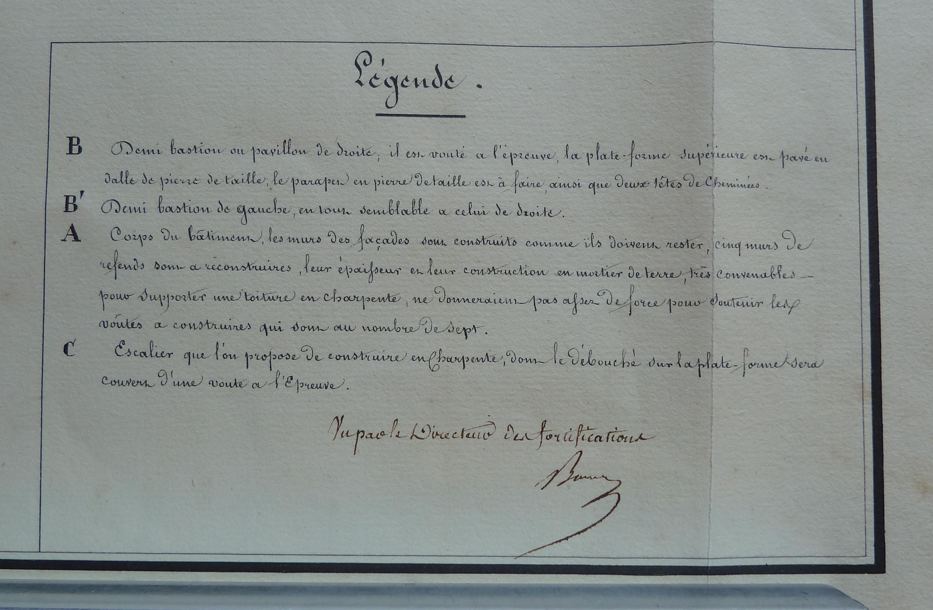 Service historique de la Défense, département Armée de Terre, Vincennes. Archives du Génie ; Article 8, Places françaises et d'Algérie : 1 VH 1516, Place de Quiberon, projets et dépenses annuels, 1823-1837. Direction du Génie de Port-Louis, Poste de Quiberon, feuille n° 1 des projets pour 1827, plan de la caserne défensive du fort Penthièvre, août 1826.