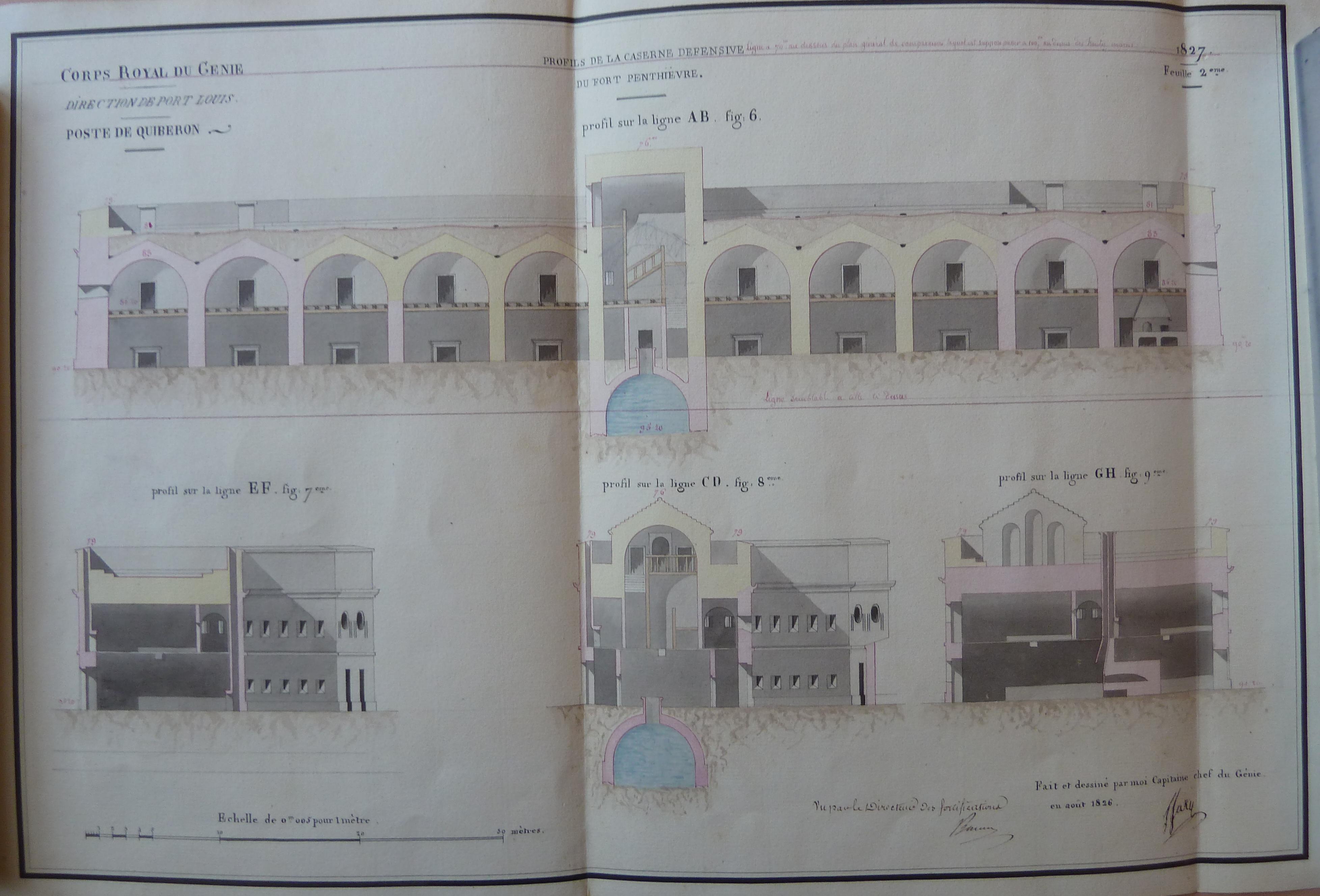Service historique de la Défense, département Armée de Terre, Vincennes. Archives du Génie ; Article 8, Places françaises et d'Algérie : 1 VH 1516, Place de Quiberon, projets et dépenses annuels, 1823-1837. Direction du Génie de Port-Louis, Poste de Quiberon, feuille n° 2 des projets pour 1827, profils de la caserne défensive du fort Penthièvre, août 1826.