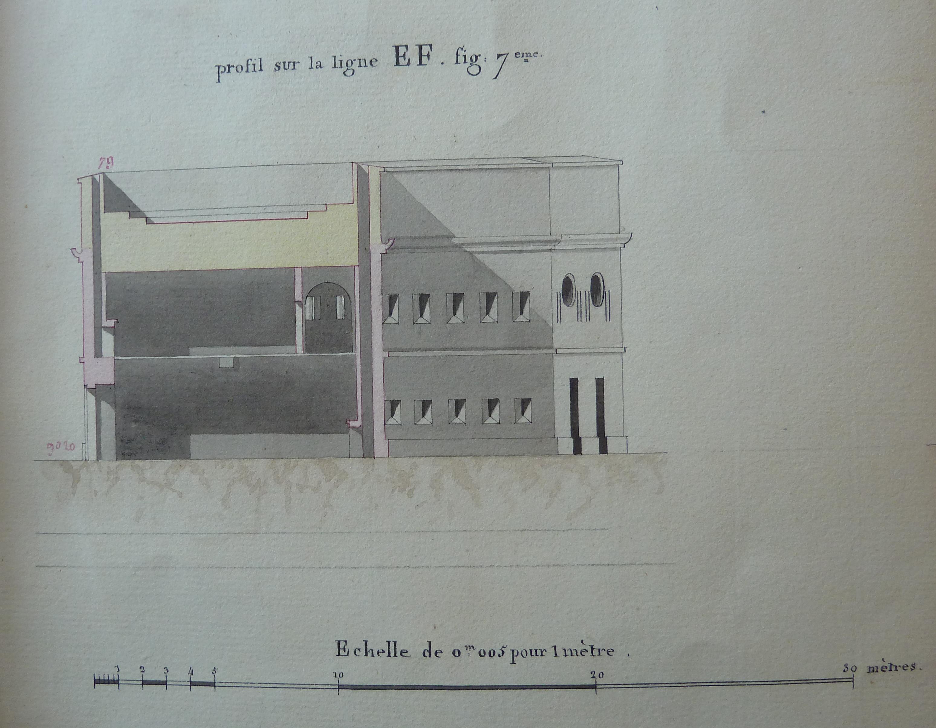 Service historique de la Défense, département Armée de Terre, Vincennes. Archives du Génie ; Article 8, Places françaises et d'Algérie : 1 VH 1516, Place de Quiberon, projets et dépenses annuels, 1823-1837. Direction du Génie de Port-Louis, Poste de Quiberon, feuille n° 2 des projets pour 1827, profils de la caserne défensive du fort Penthièvre, août 1826.