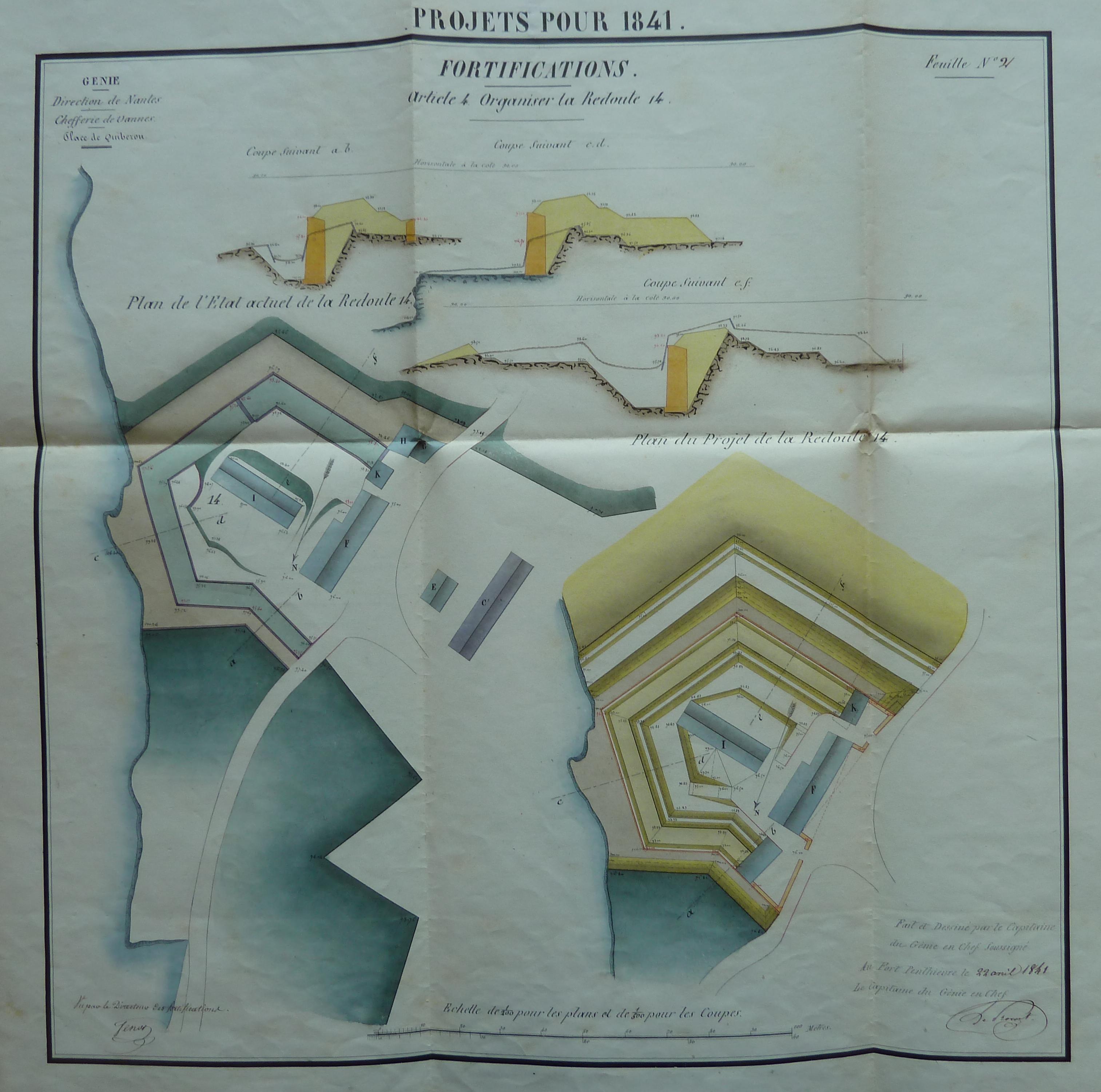 Service historique de la Défense, département Armée de Terre, Vincennes. Archives du Génie ; Article 8, Places françaises et d'Algérie : 1 VH 1517, Place de Quiberon, projets et dépenses annuels, 1838-1846. Direction du Génie de Nantes, Place de Quiberon, feuille n° 2 des projets pour 1841, organiser la redoute 14, 22 avril 1841.