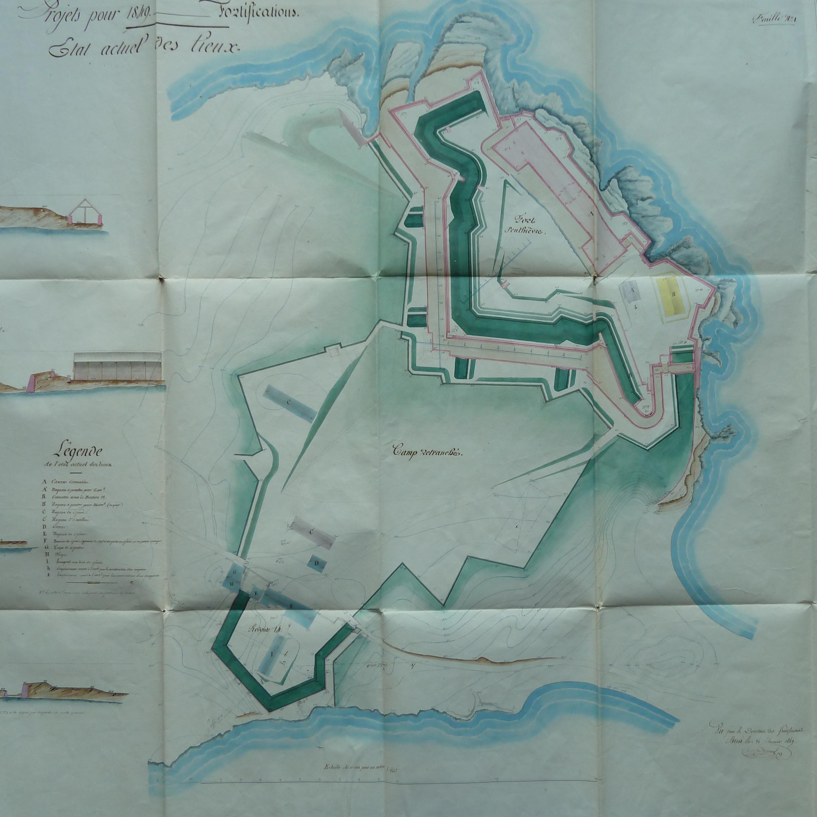 Service historique de la Défense, département Armée de Terre, Vincennes. Archives du Génie ; Article 8, Places françaises et d'Algérie : 1 VH 1518, Place de Quiberon, projets et dépenses annuels, 1847-1874. Direction du Génie de Nantes, Place de Quiberon, feuille n° 1 des projets pour 1849, état actuel des lieux, 26 janvier 1849.