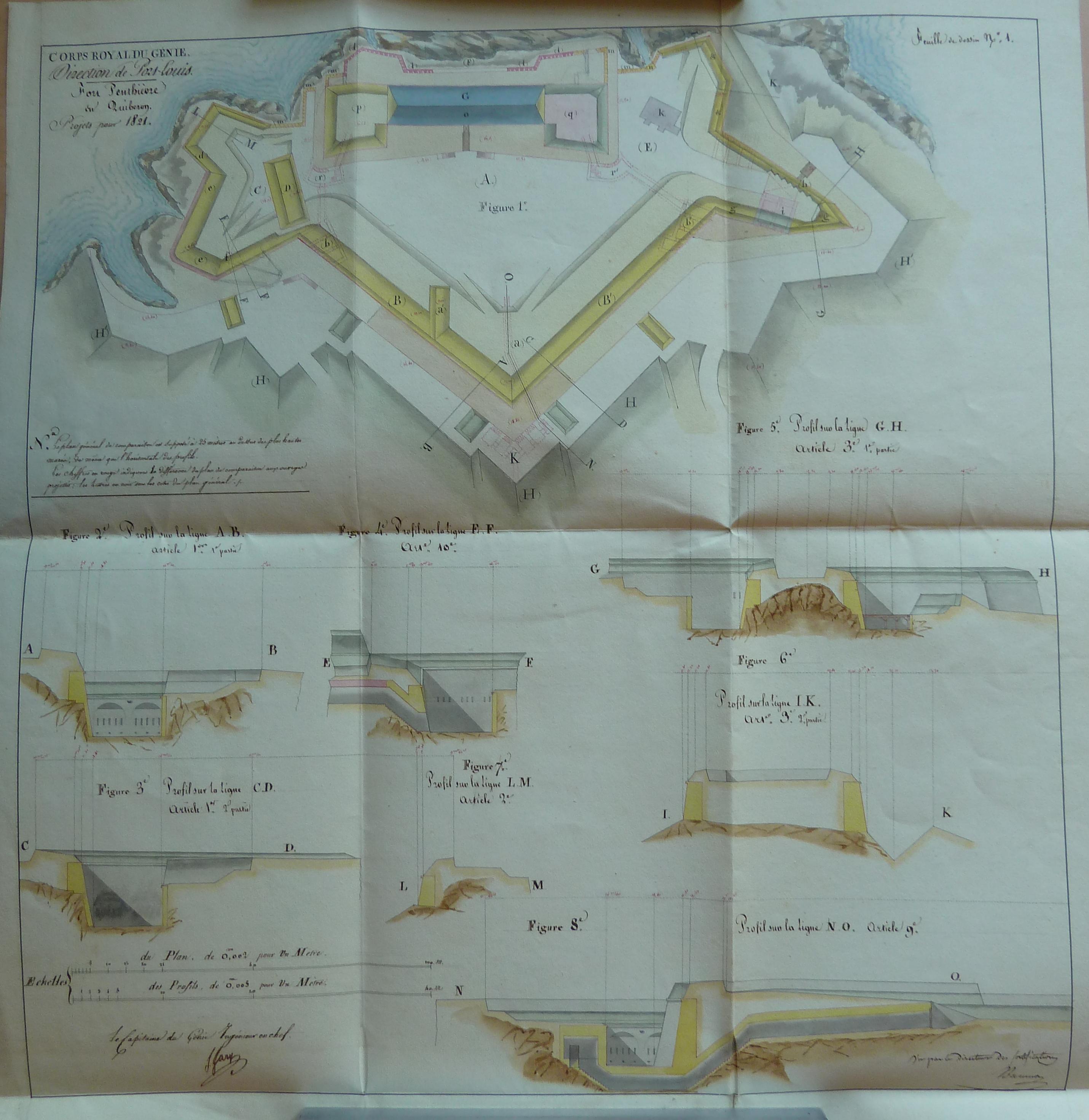 Service historique de la Défense, département Armée de Terre, Vincennes. Archives du Génie ; Article 8, Places françaises et d'Algérie : 1 VH 1515, Place de Quiberon, projets et dépenses annuels, 1747-1822. Direction du Génie de Port-Louis, Fort Penthièvre, feuille n° 1 des projets pour 1821.