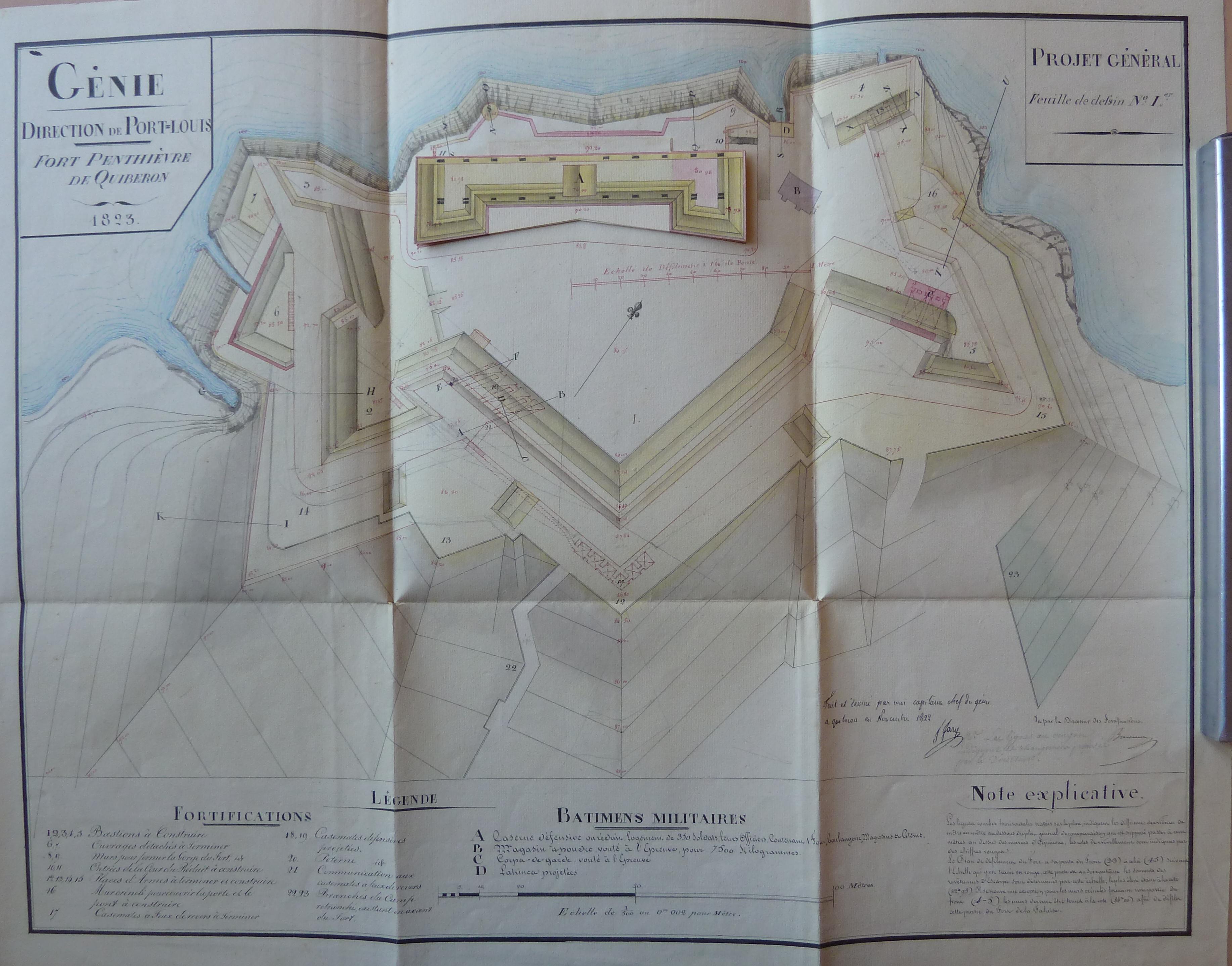 Service historique de la Défense, département Armée de Terre, Vincennes. Archives du Génie ; Article 8, Places françaises et d'Algérie : 1 VH 1515, Place de Quiberon, projets et dépenses annuels, 1747-1822. Direction du Génie de Port-Louis, Fort Penthièvre, feuille n° 1 des projets pour 1823, décembre 1822.