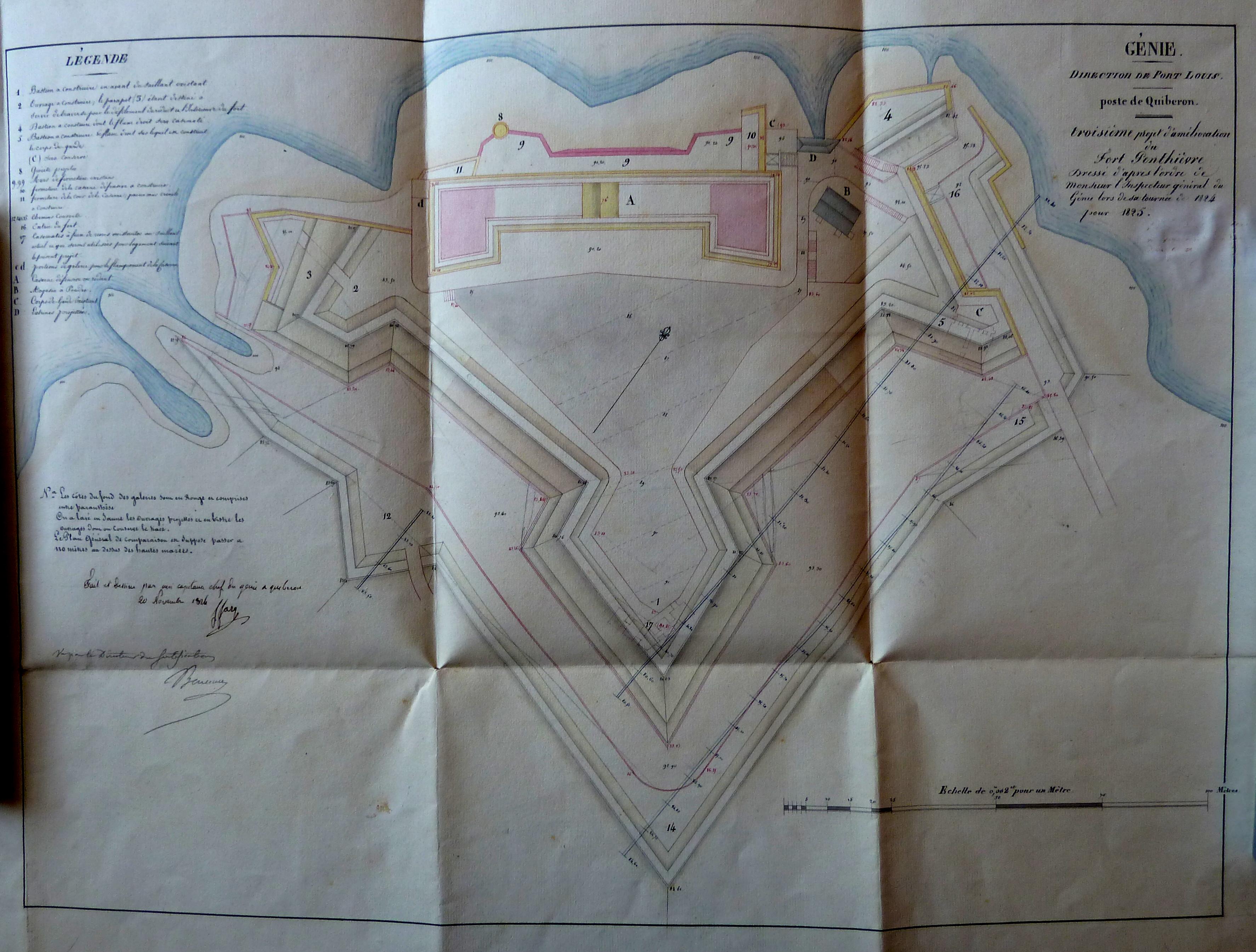 Service historique de la Défense, département Armée de Terre, Vincennes. Archives du Génie ; Article 8, Places françaises et d'Algérie : 1 VH 1516, Place de Quiberon, projets et dépenses annuels, 1823-1837. Direction du Génie de Port-Louis, Poste de Quiberon, troisième projet d'amélioration du fort Penthièvre dressé d'après l'ordre de monsieur l'Inspecteur général du Génie lors de sa tournée de 1824 pour 1825, 20 novembre 1824.
