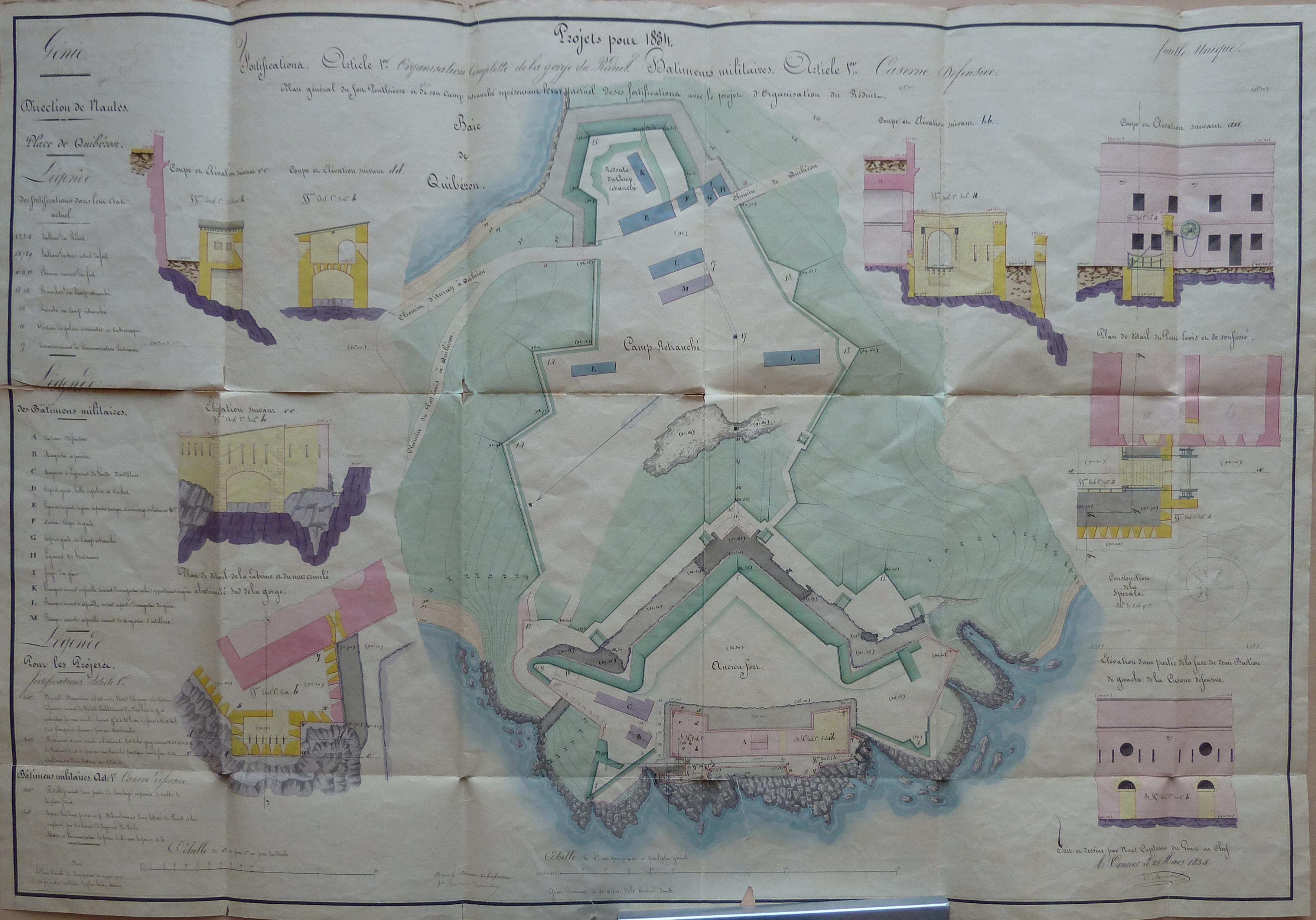 Service historique de la Défense, département Armée de Terre, Vincennes. Archives du Génie ; Article 8, Places françaises et d'Algérie : 1 VH 1516, Place de Quiberon, projets et dépenses annuels, 1823-1837. Direction du Génie de Nantes, Place de Quiberon, feuille des projets pour 1834, plan général du fort Penthièvre et de son camp retranché, 25 mars 1834.