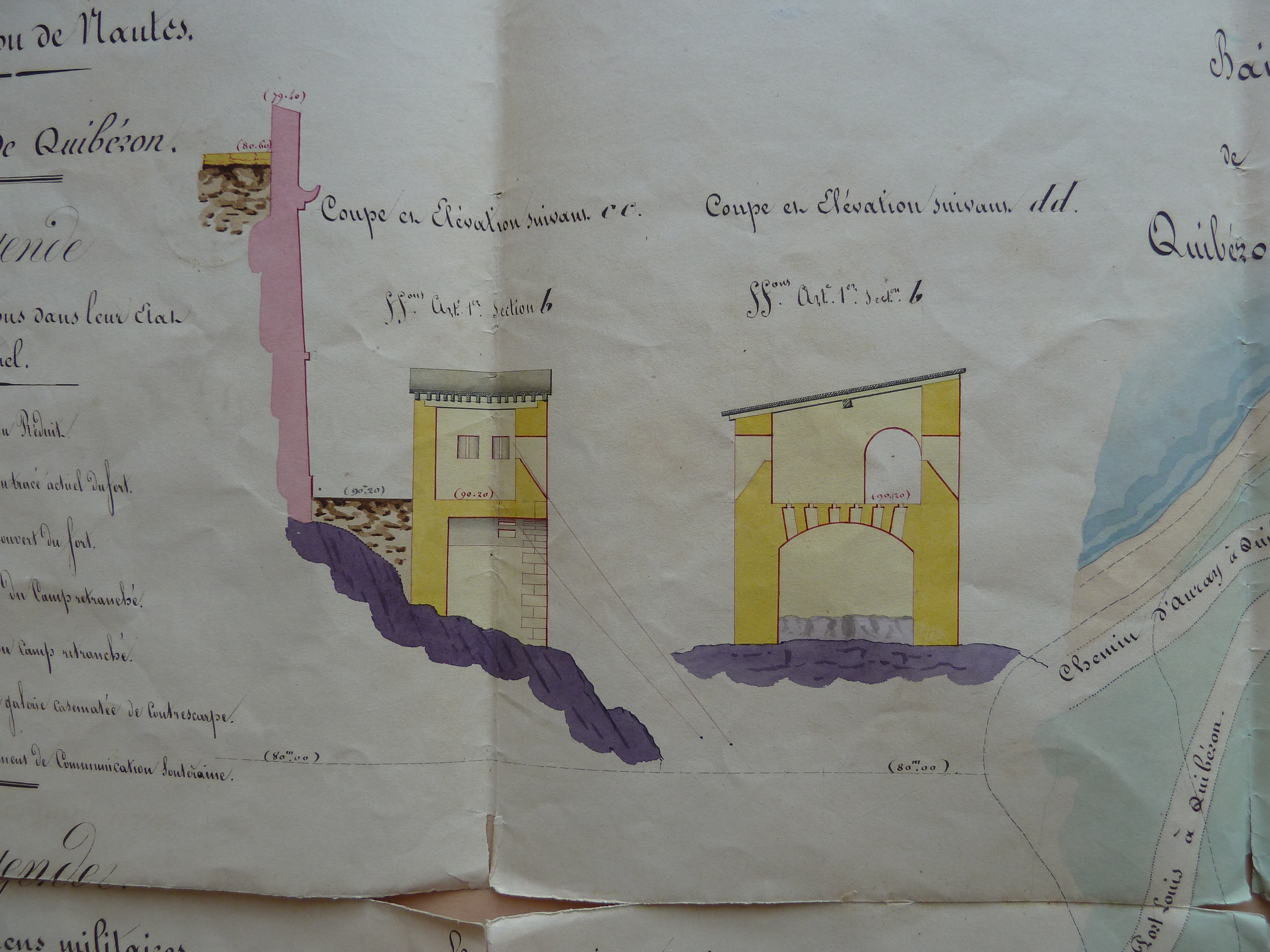 Service historique de la Défense, département Armée de Terre, Vincennes. Archives du Génie ; Article 8, Places françaises et d'Algérie : 1 VH 1516, Place de Quiberon, projets et dépenses annuels, 1823-1837. Direction du Génie de Nantes, Place de Quiberon, feuille des projets pour 1834, plan général du fort Penthièvre et de son camp retranché, 25 mars 1834.