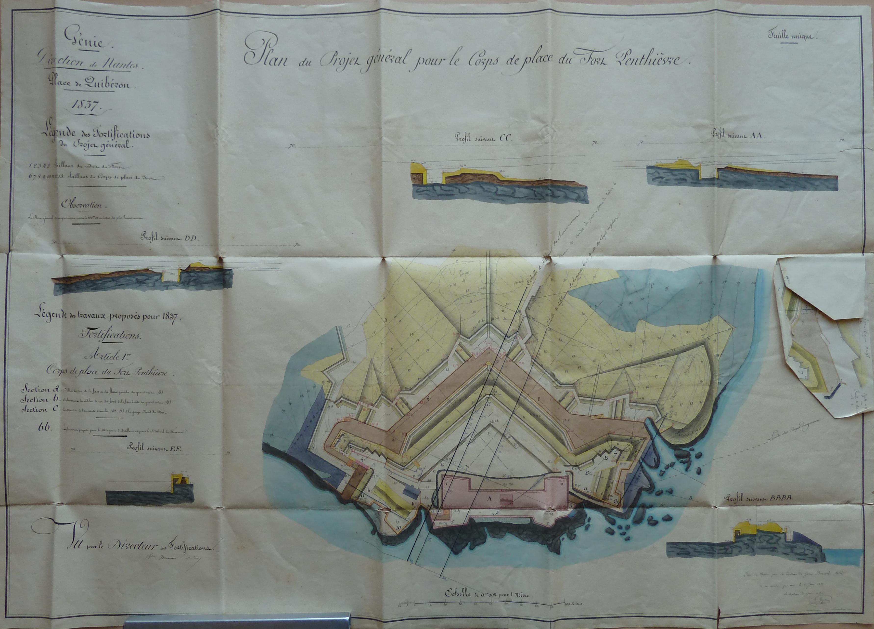 Service historique de la Défense, département Armée de Terre, Vincennes. Archives du Génie ; Article 8, Places françaises et d'Algérie : 1 VH 1516, Place de Quiberon, projets et dépenses annuels, 1823-1837. Direction du Génie de Nantes, Place de Quiberon, feuille des projets pour 1837, plan du projet général pour le corps de place du fort Penthièvre.