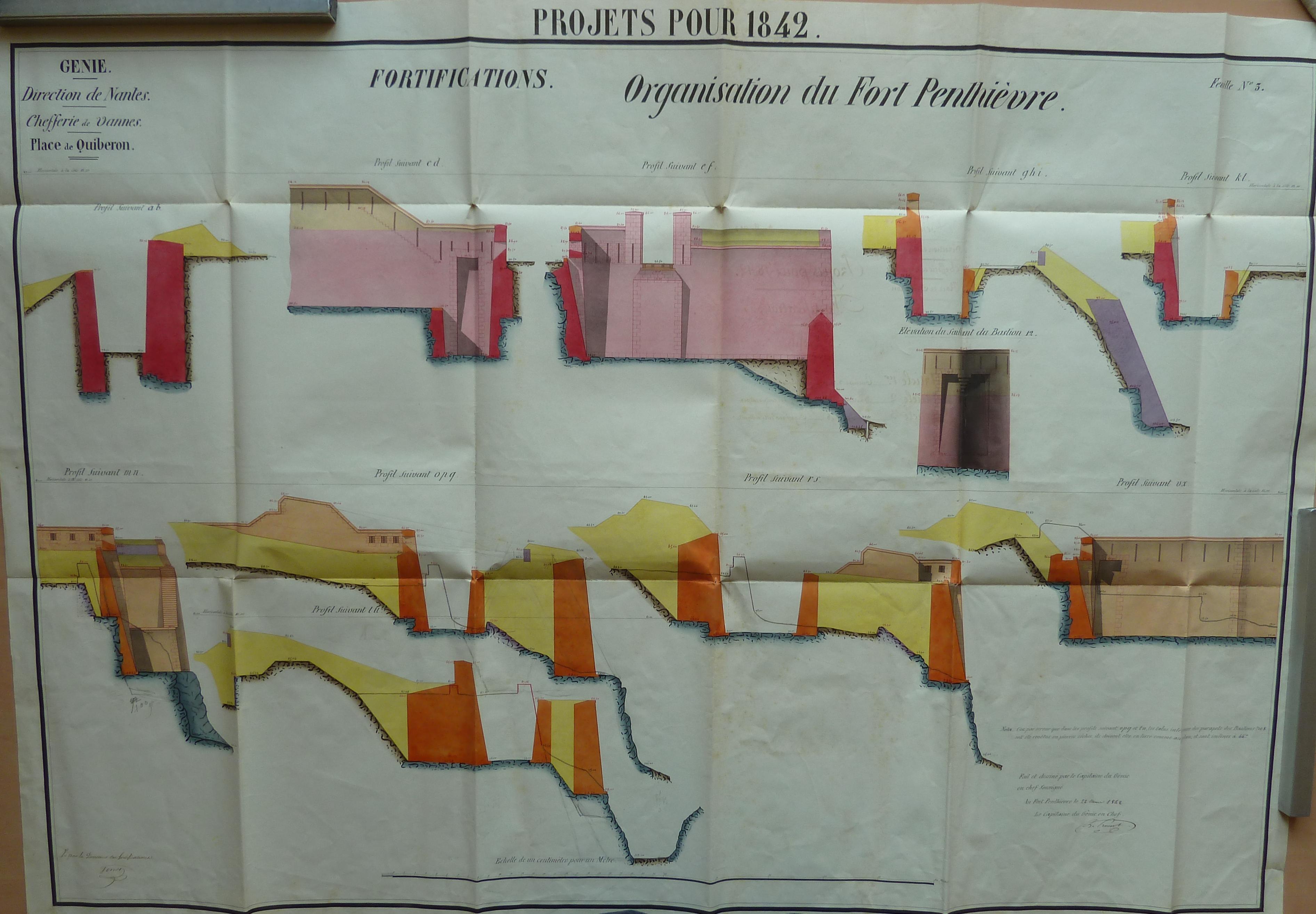 Service historique de la Défense, département Armée de Terre, Vincennes. Archives du Génie ; Article 8, Places françaises et d'Algérie : 1 VH 1517, Place de Quiberon, projets et dépenses annuels, 1838-1846. Direction du Génie de Nantes, Place de Quiberon, feuille n° 3 des projets pour 1842, organisation du fort Penthièvre, profils, 22 mars 1842.