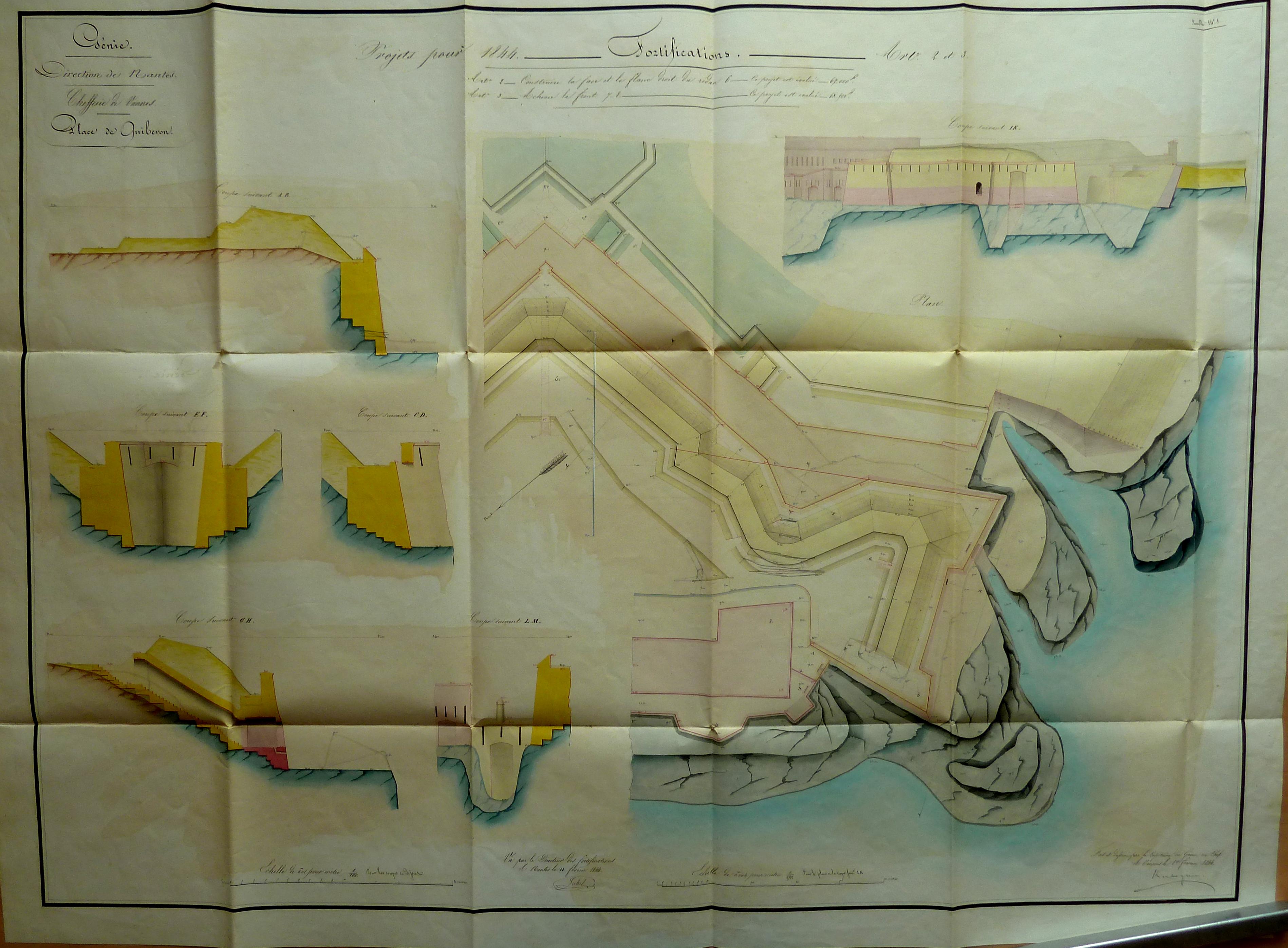 Service historique de la Défense, département Armée de Terre, Vincennes. Archives du Génie ; Article 8, Places françaises et d'Algérie : 1 VH 1517, Place de Quiberon, projets et dépenses annuels, 1838-1846. Direction du Génie de Nantes, Place de Quiberon, feuille n° 1 des projets pour 1844, redan 6, front 7-8, 1er février 1844.