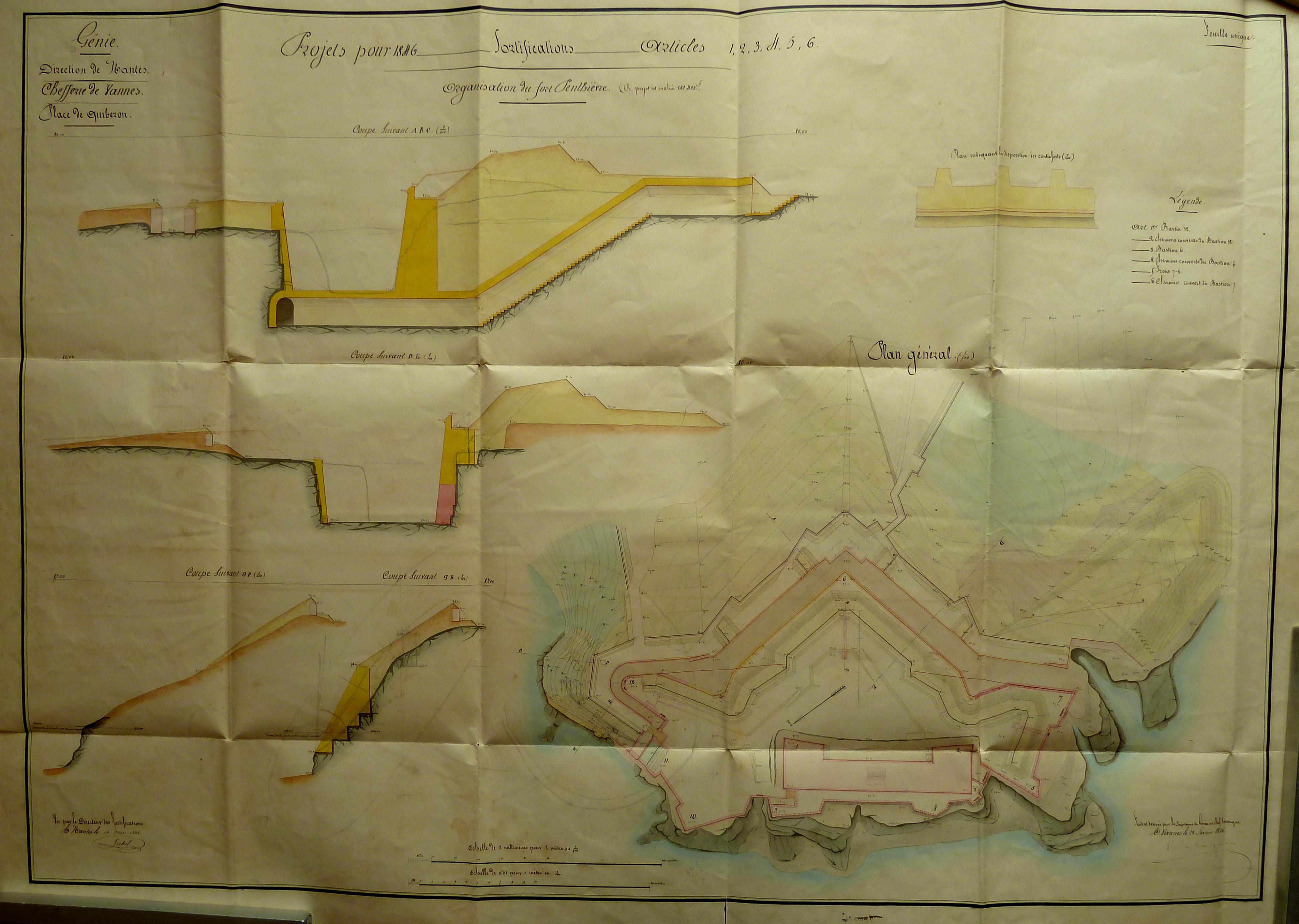 Service historique de la Défense, département Armée de Terre, Vincennes. Archives du Génie ; Article 8, Places françaises et d'Algérie : 1 VH 1517, Place de Quiberon, projets et dépenses annuels, 1838-1846. Direction du Génie de Nantes, Place de Quiberon, feuille des projets pour 1846, organisation du fort Penthièvre, 25 février 1846.